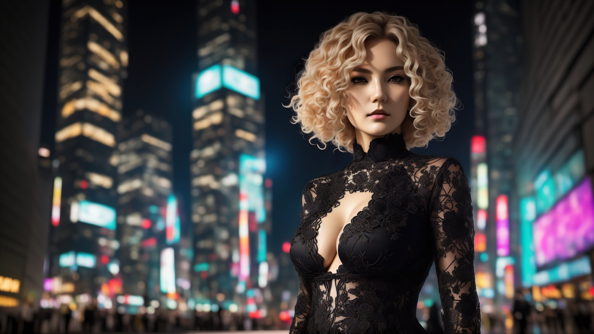 Description: A woman in a black dress standing in front of a cityscape at night with a cityscape in the background.