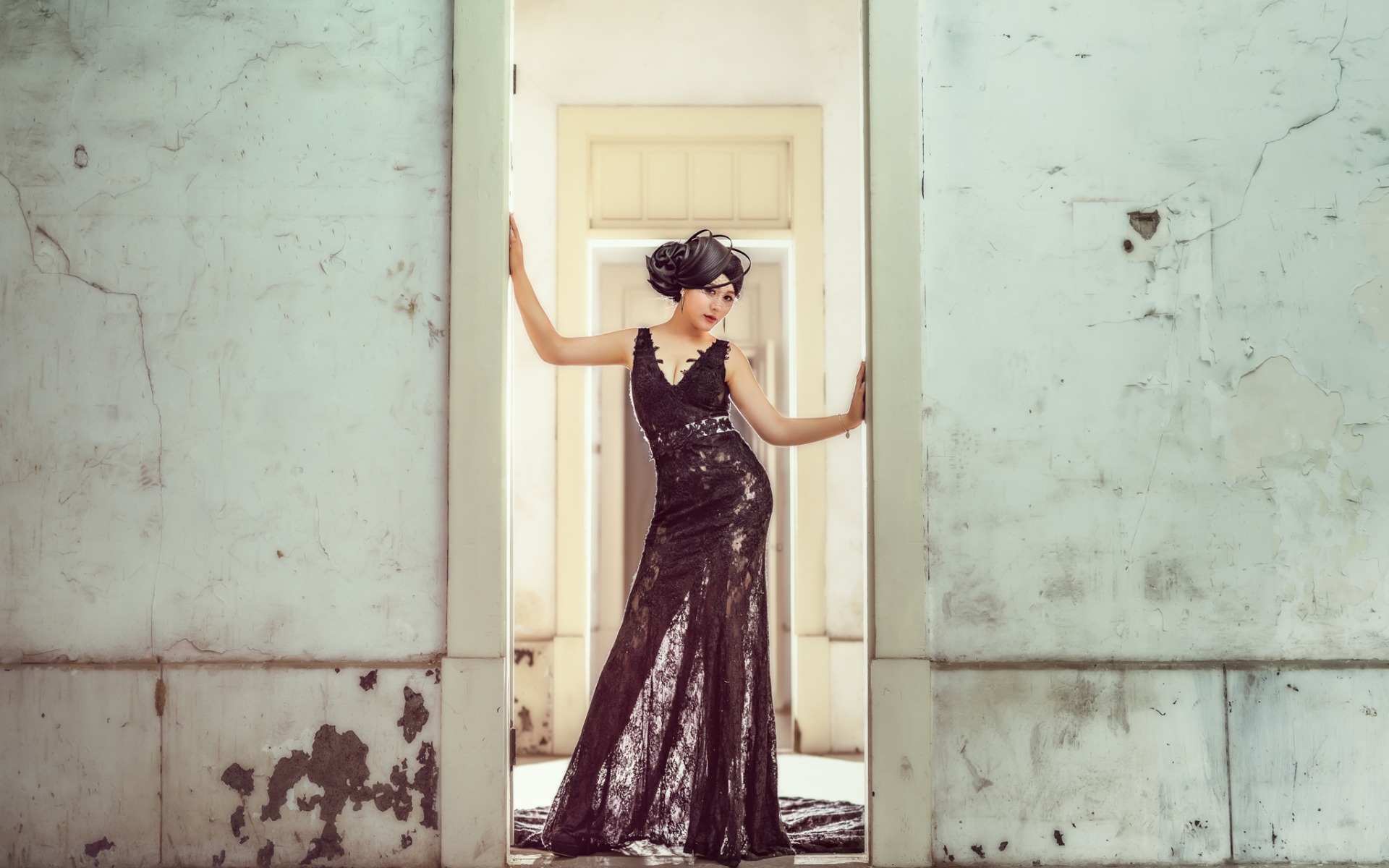 Description: A woman in a black dress is standing in a doorway with her hands up and her arms out to the side.