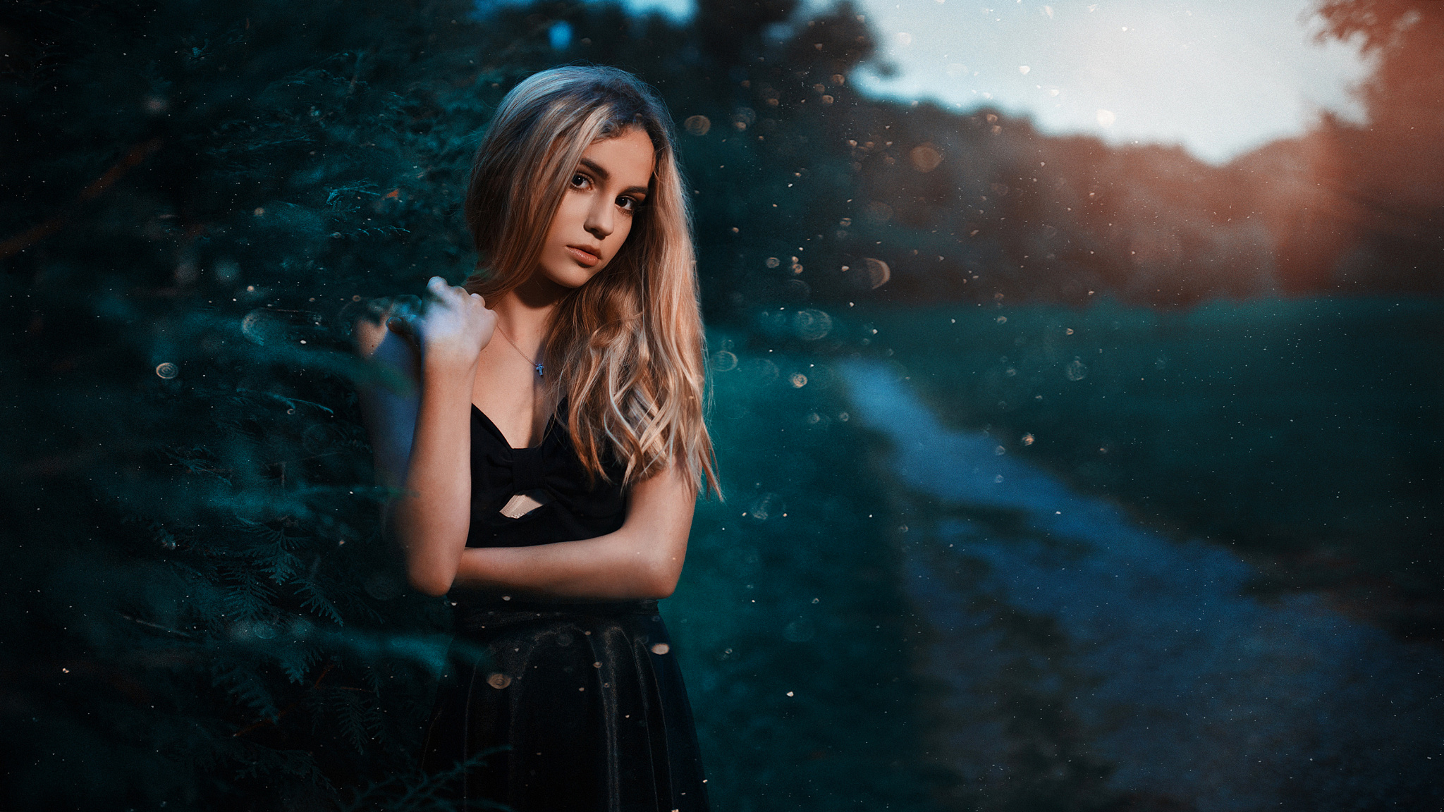 Description: A woman in a black dress standing in a field with trees in the background and a blurry background.