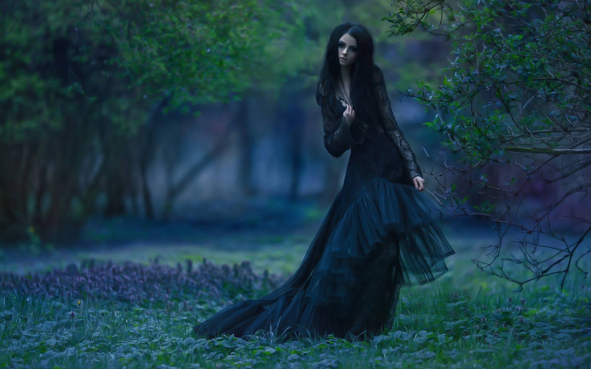 Description: A woman in a black dress standing in a forest with trees and grass in the background.