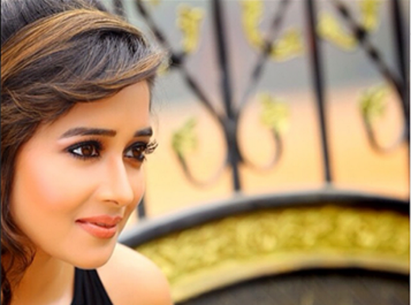 Description: A woman with a black dress and a black tie and a black and gold background and a gold gate.
