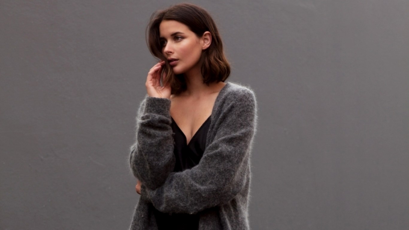 Description: A woman in a black dress and a gray cardigan sweater is posing for a picture with her hand on her face.