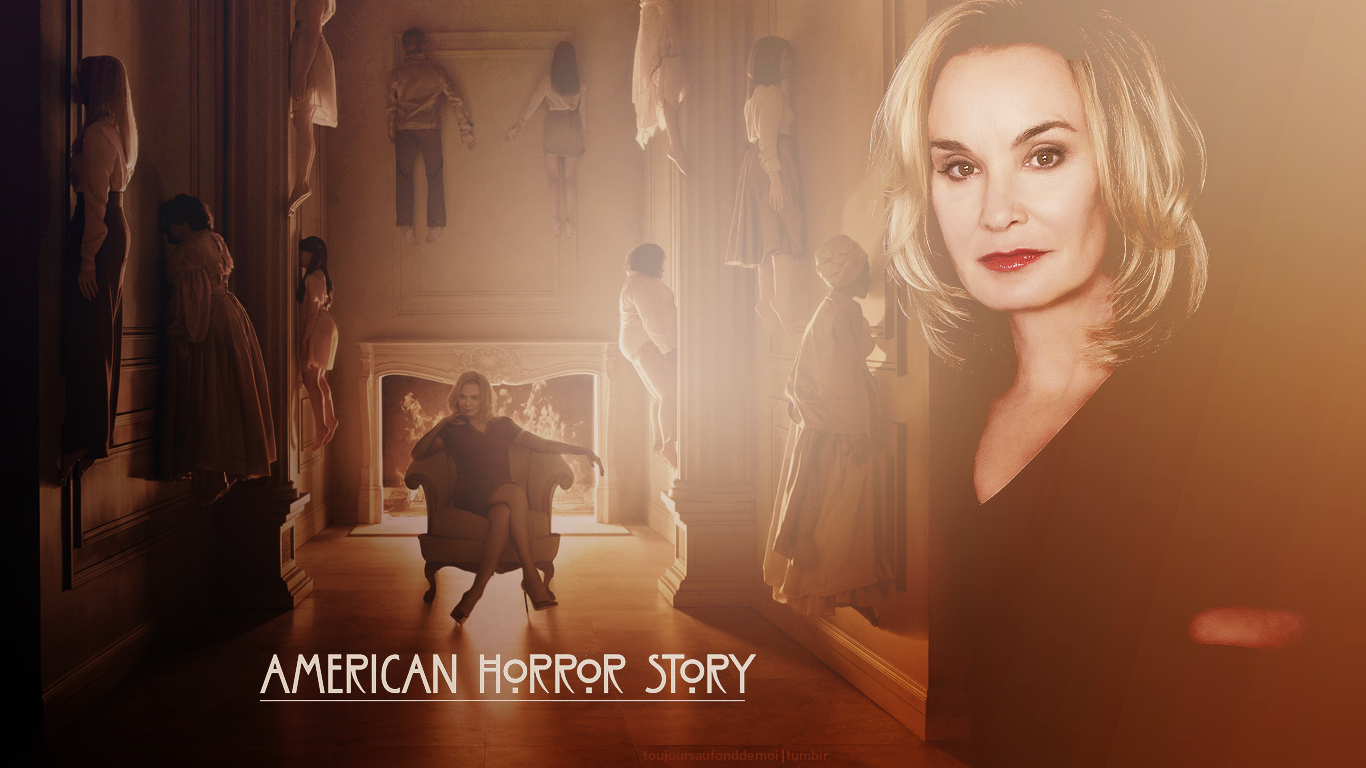 Description: A woman in a black dress standing in a hallway with a man in a suit and tie in front of a poster of a group of people.