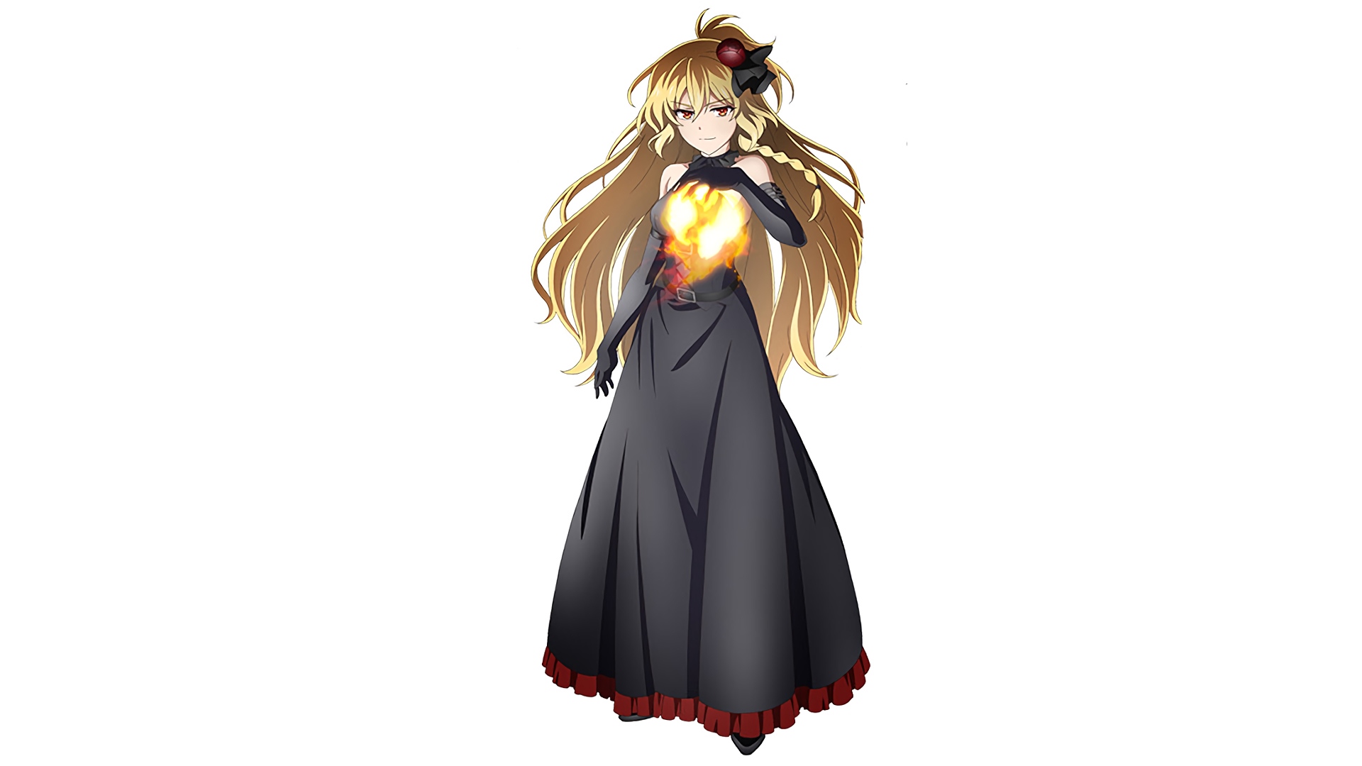 Description: A woman in a long black dress holding a heart shaped object in her hands and a red ribbon around her neck.