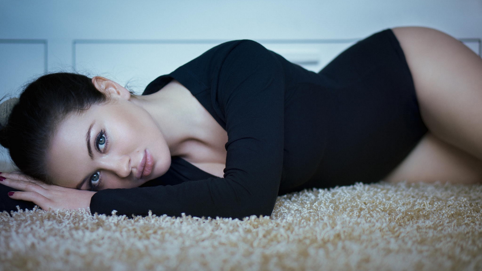 Description: A woman laying on the floor in a black dress and heels with her hands on her chest and her eyes closed.
