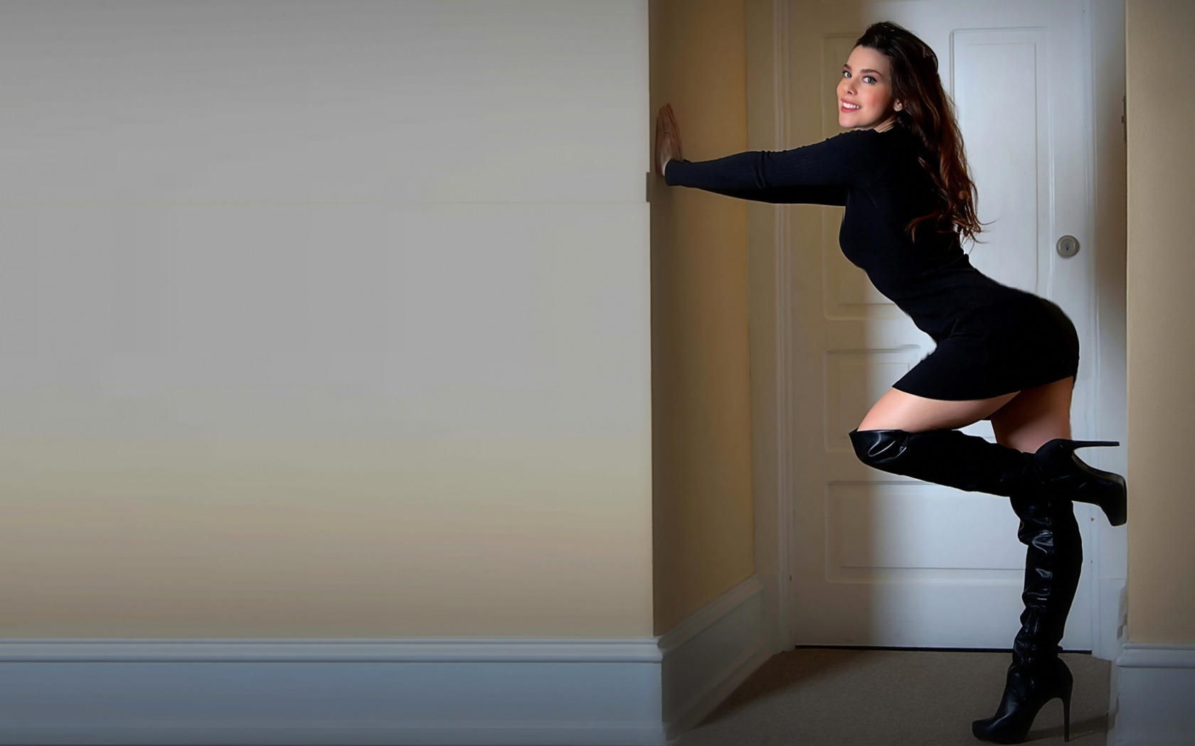Description: A woman in a black dress and high heel boots leaning against a wall with her leg up and her hand on the wall.