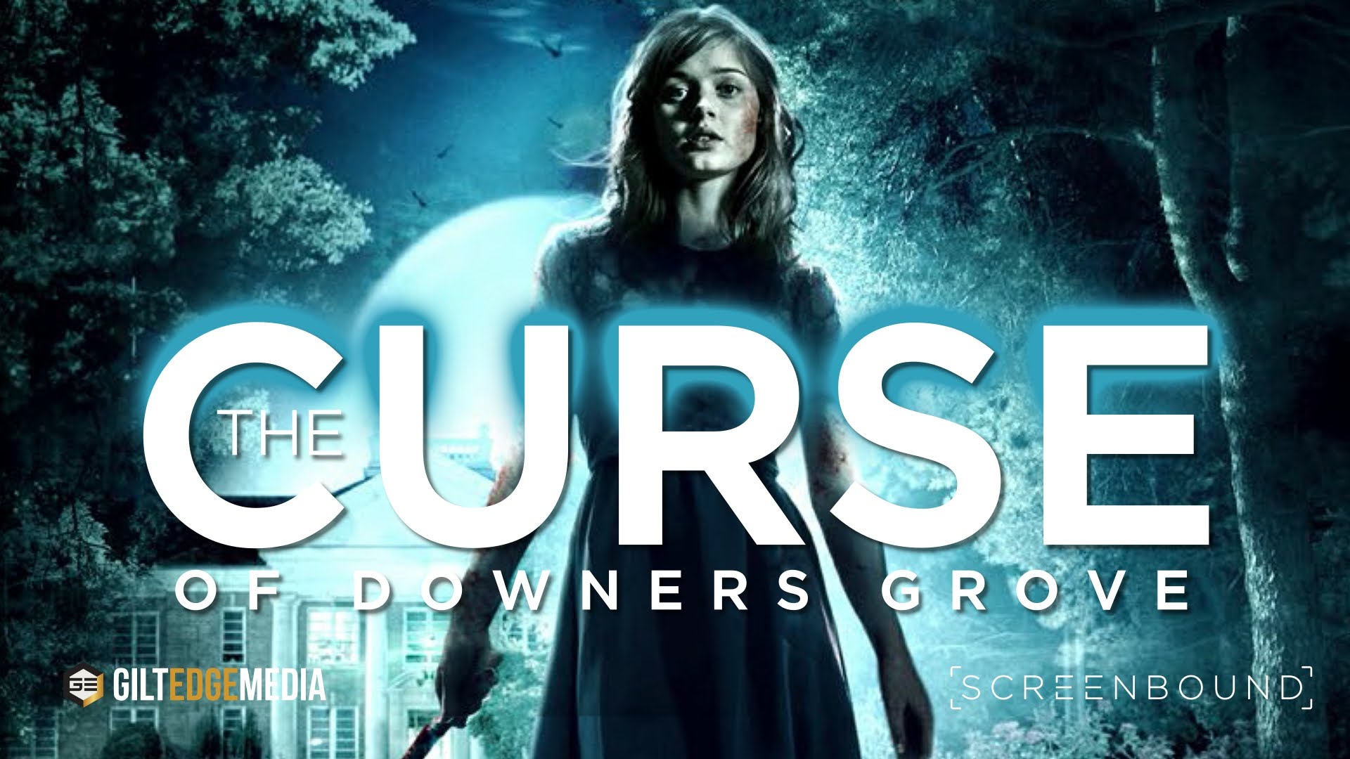 Description: A woman in a black dress holding a knife in front of a forest with a house in the background.