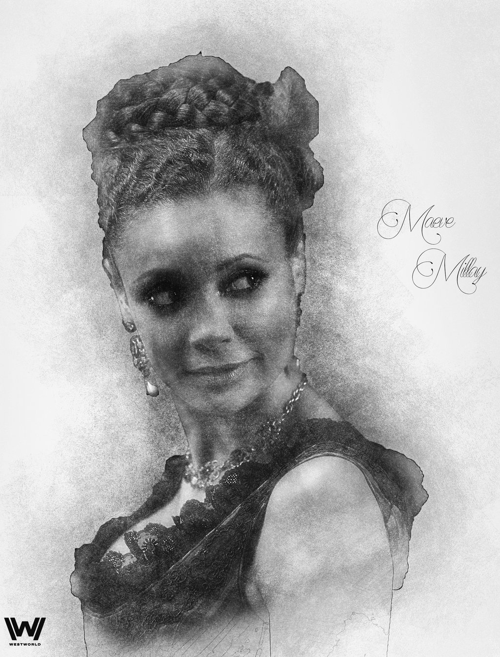Description: A drawing of a woman with a black dress and a necklace on her neck and a name on her forehead.