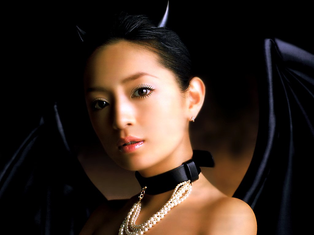 Description: A woman wearing a black dress and a necklace with pearls on it's neck and a black bat.