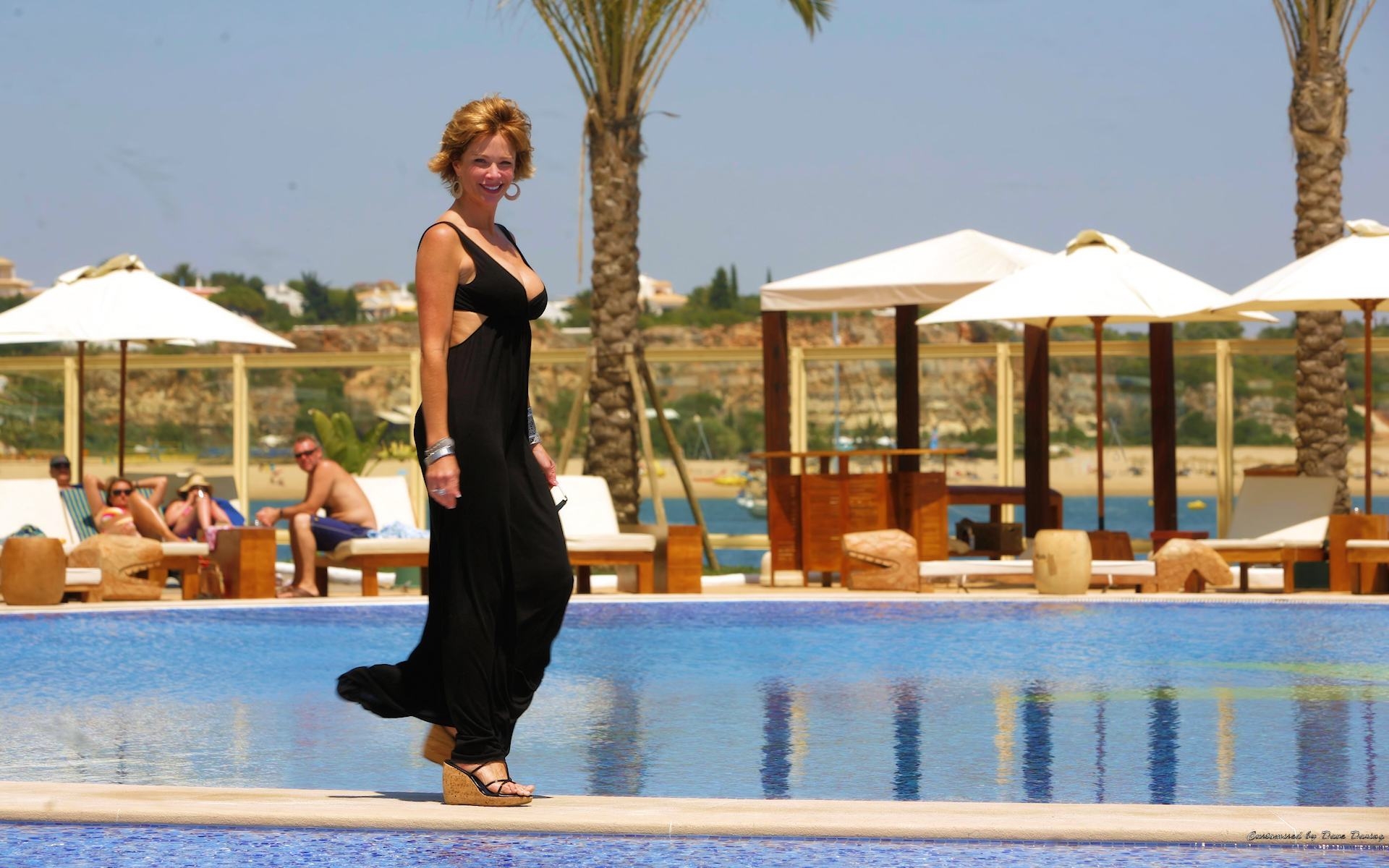 Description: A woman in a black dress standing by a pool with umbrellas in the background and people sitting in lounge chairs.