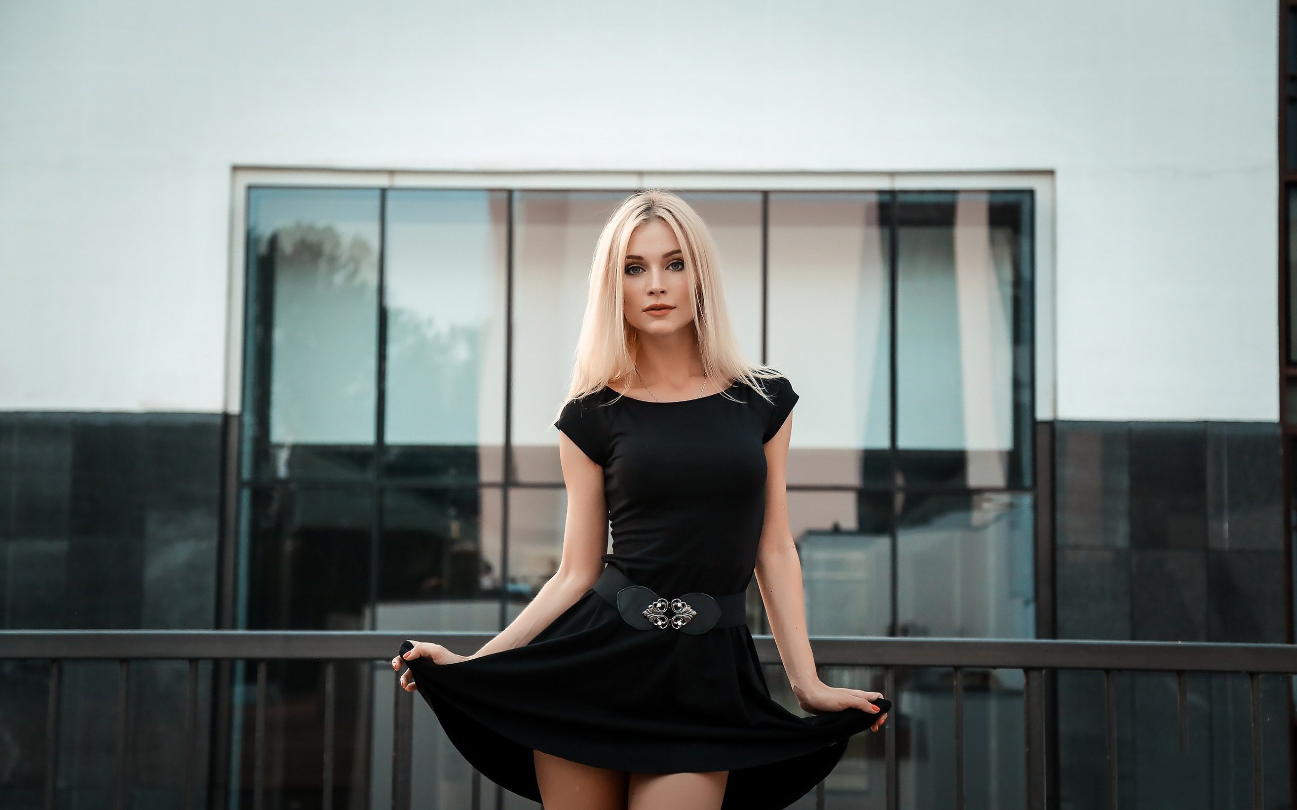Description: A woman in a short black dress posing for a picture with her hands on her hips and her legs crossed.