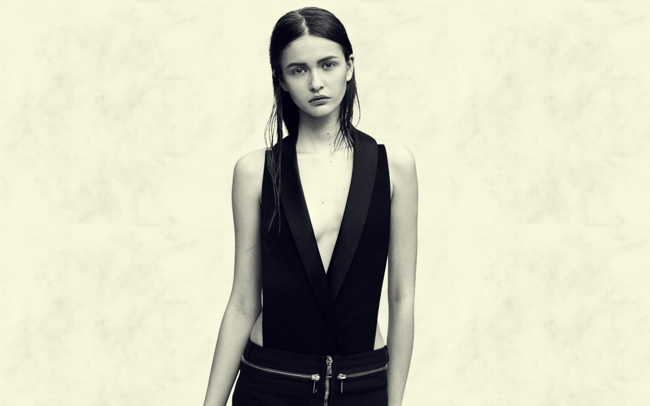 Description: A woman in a black dress posing for a picture with a white background and a wall behind her.