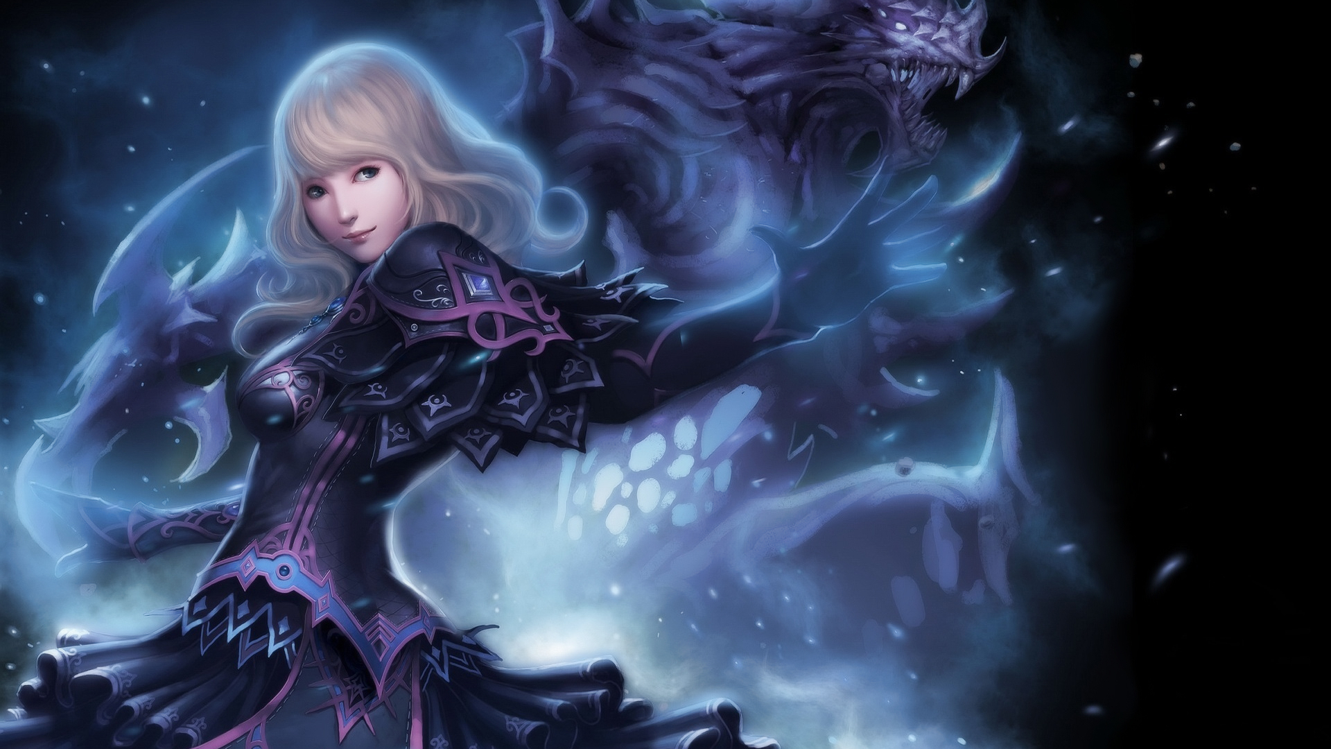 Description: A woman in a black dress holding a purple dragon in her hand and a black background with a blue dragon.