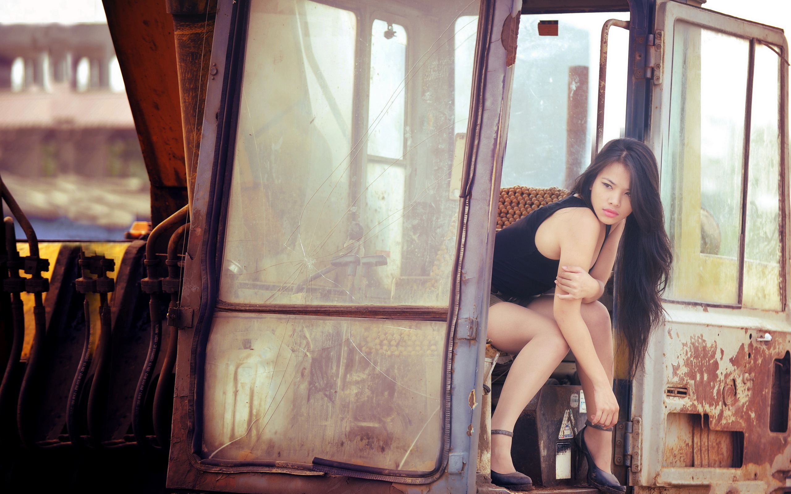 Description: A woman in a black dress leaning on a rusty truck door with her legs crossed and her hand on her hips.