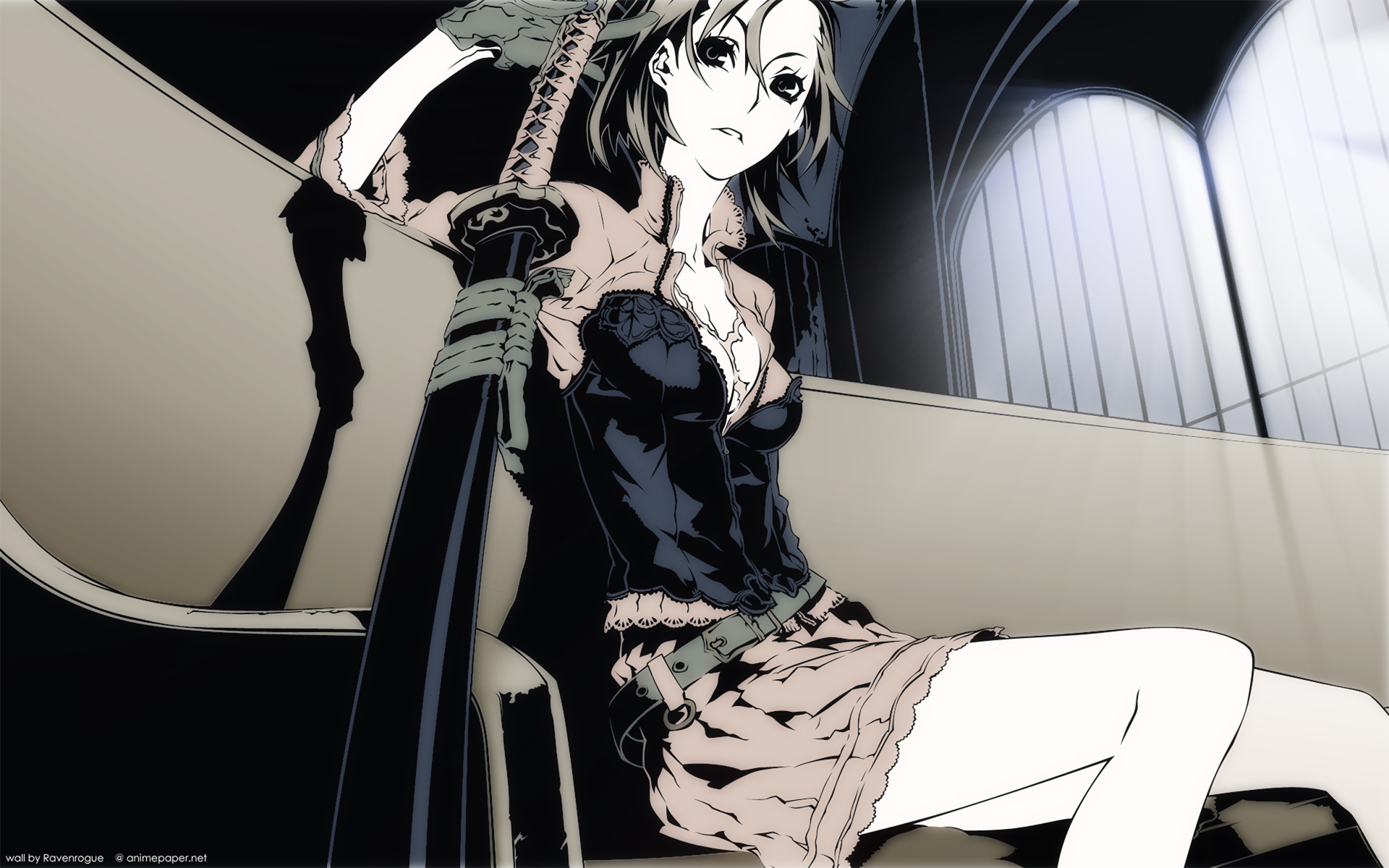 Description: A woman in a black dress sitting on a chair with a sword in her hand and a clock in the background.