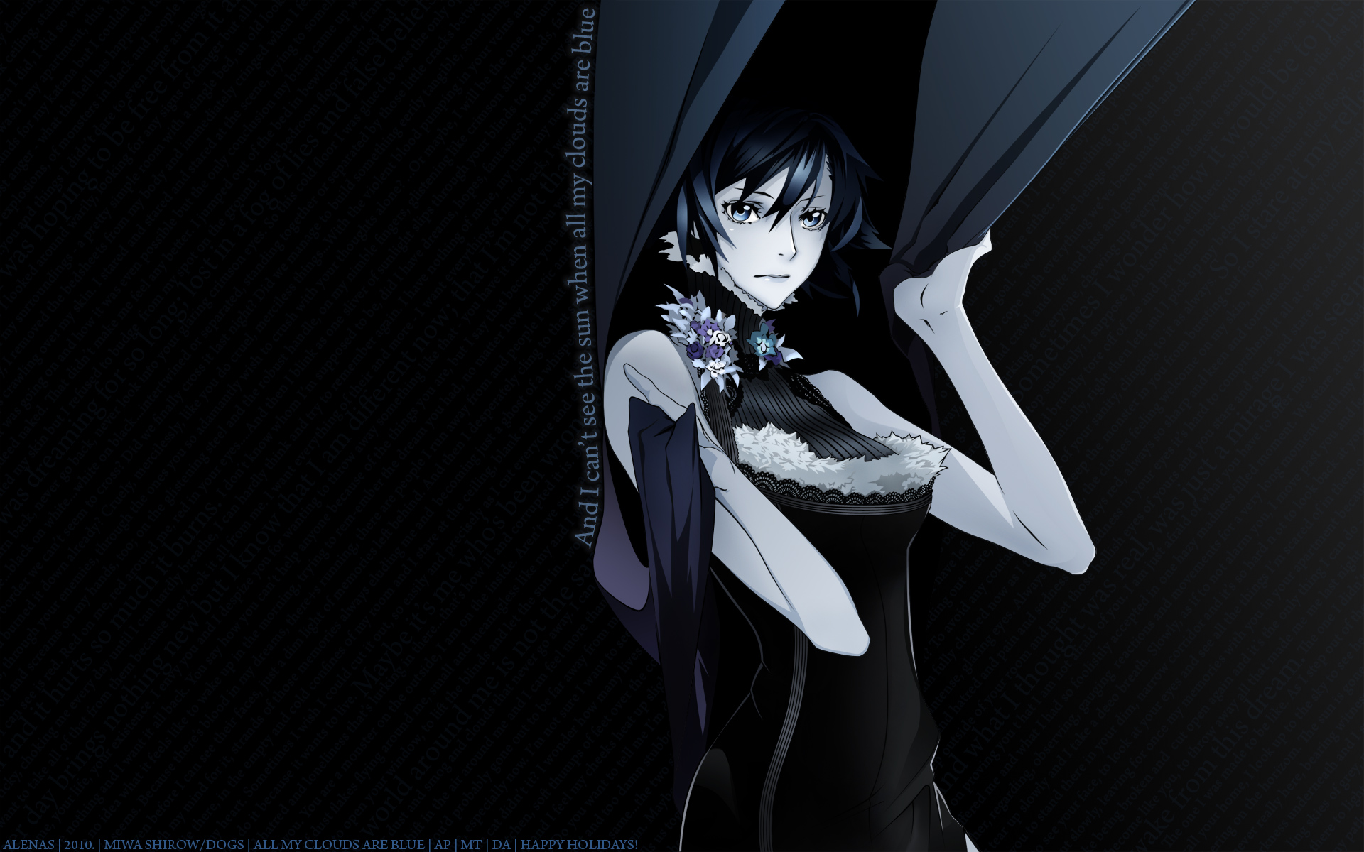 Description: A woman in a black dress holding a black umbrella and a black background with a white and blue flower.