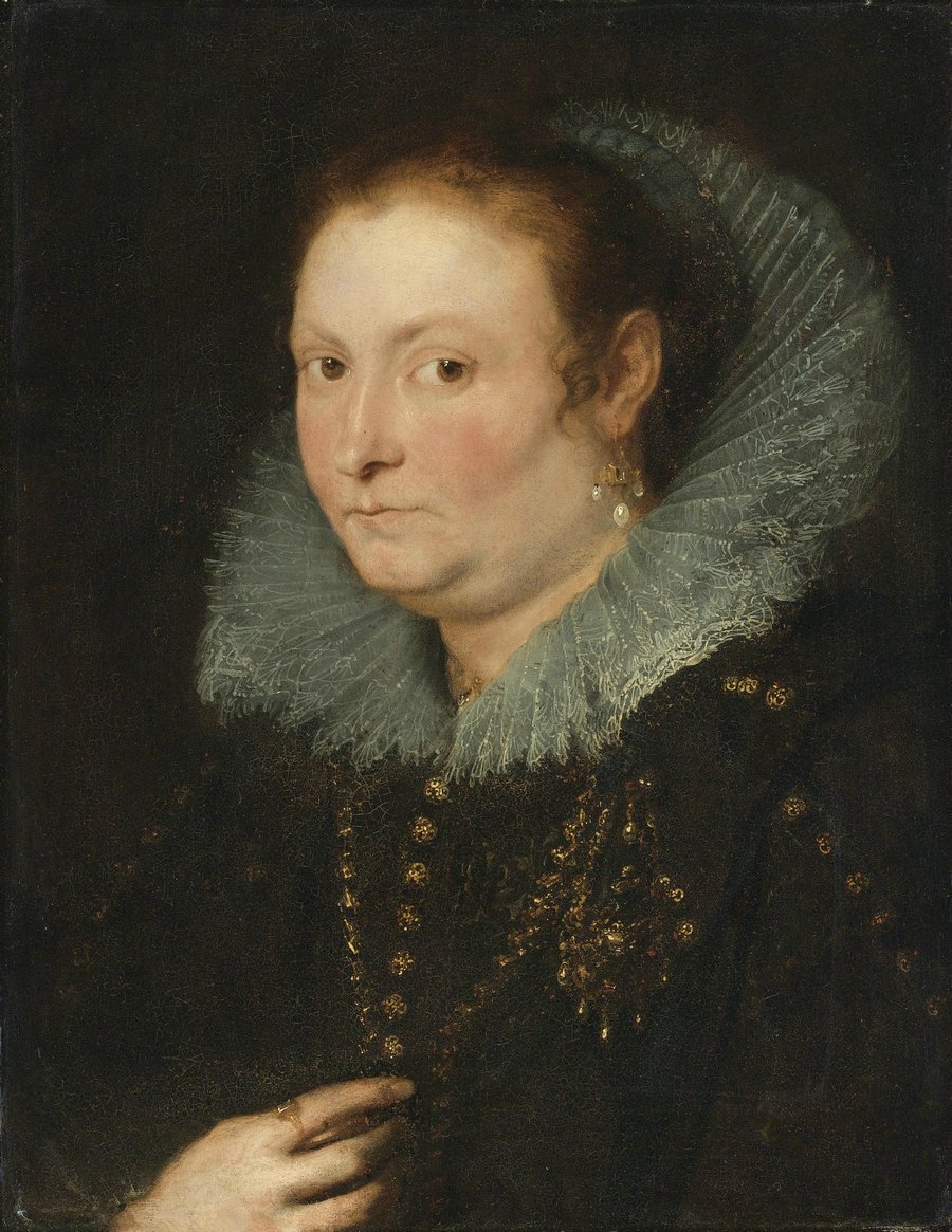 Description: A painting of a woman in a black dress with a white collar and a green ruffle on her head.