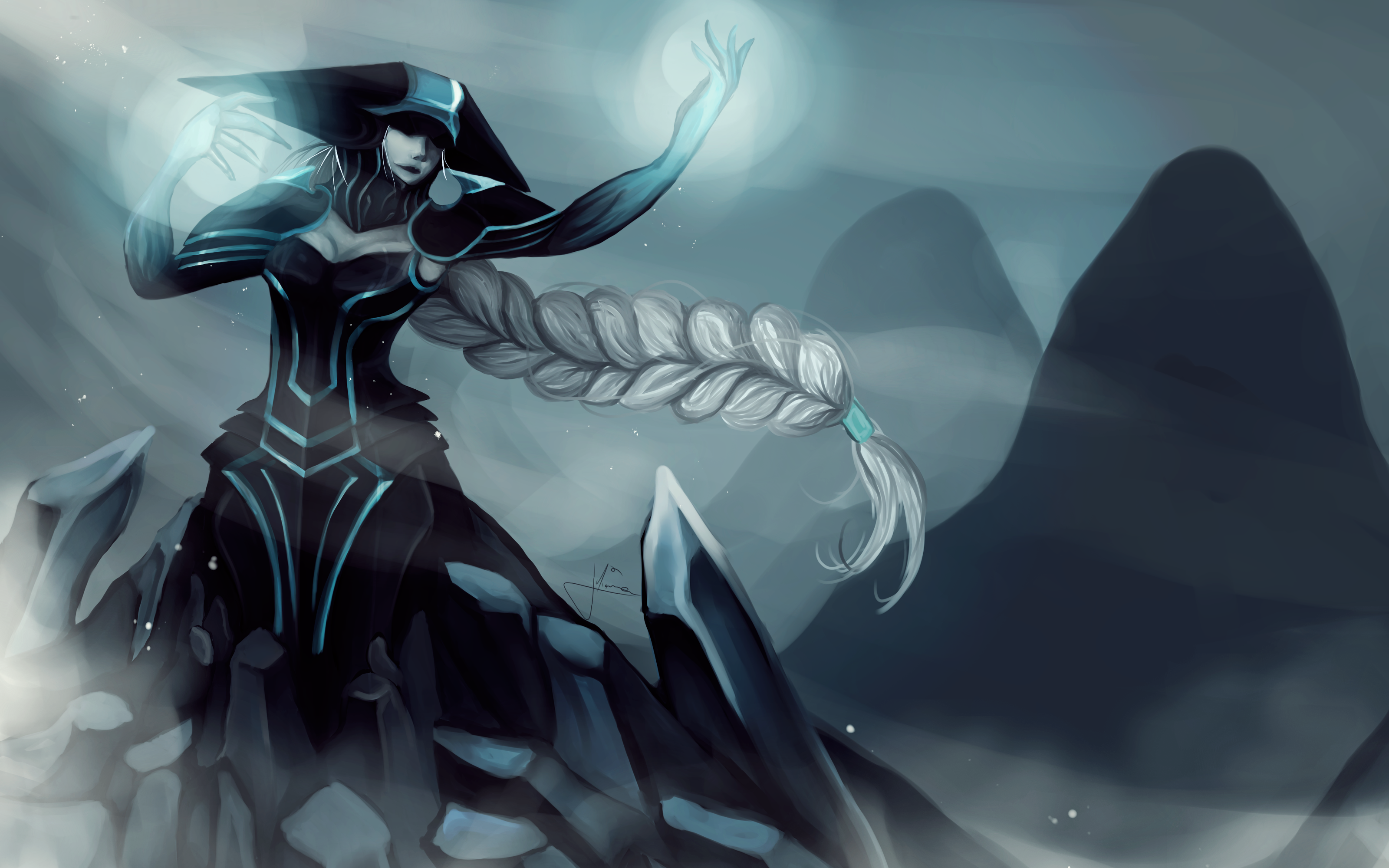 Description: A woman in a black dress holding a long white feather in her hand and a black hat on her head.