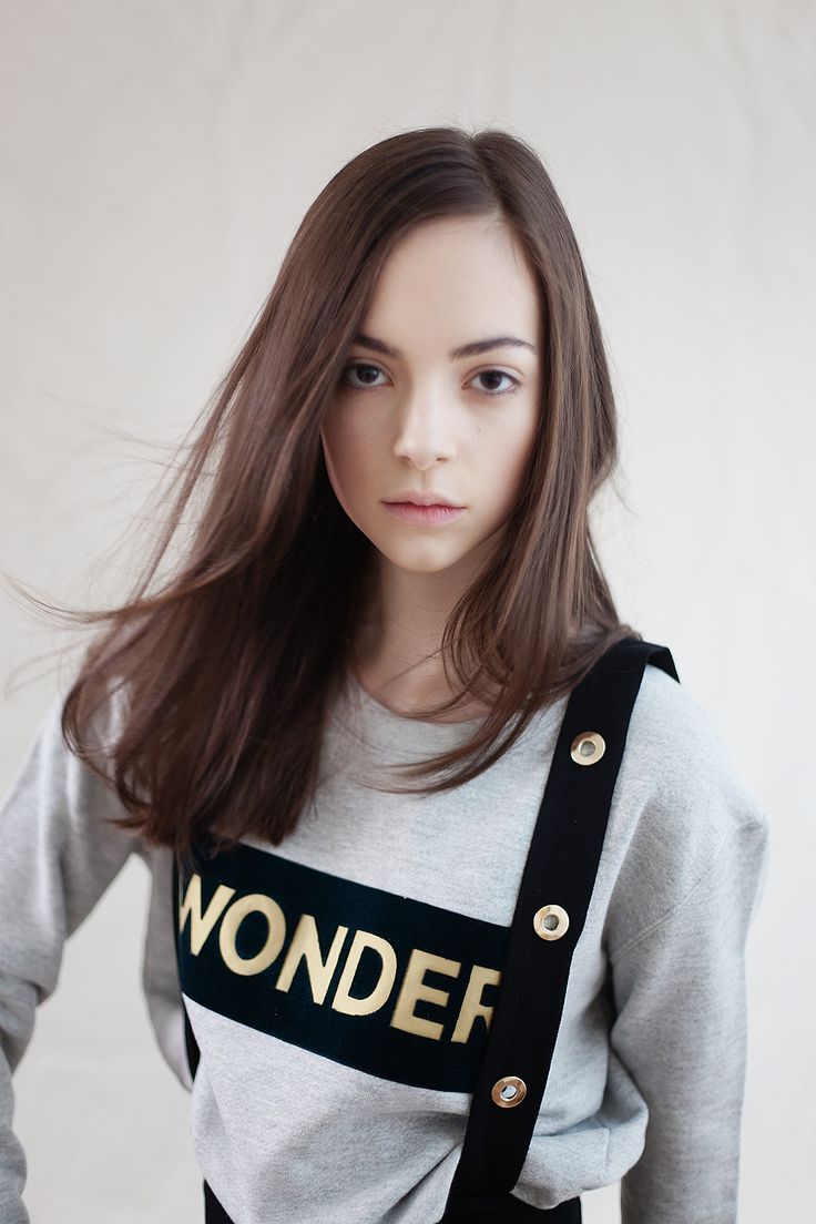 Description: A woman with a black and gold wonder belt around her waist and a grey sweater with a wonder written on it.
