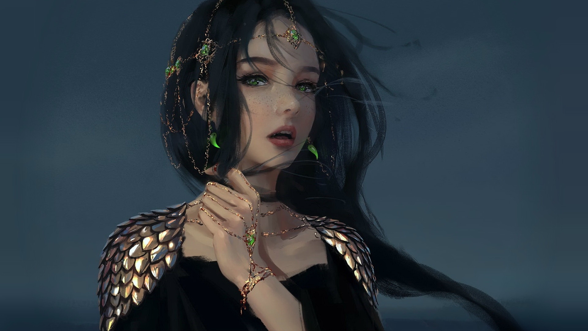 Description: A woman with long black hair and green eyes wearing a necklace and earrings with gold chains and green beads.