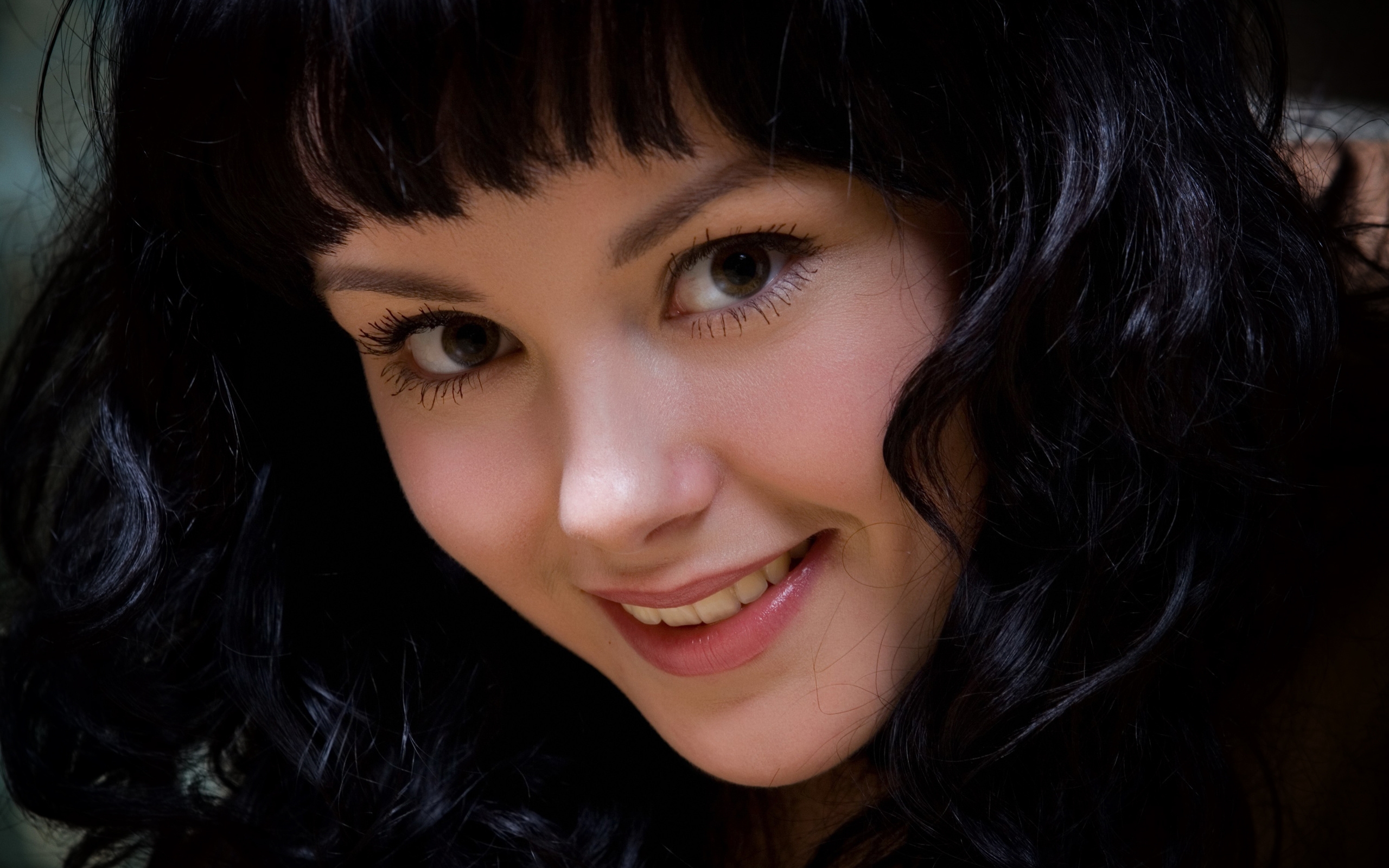 Description: A woman with black hair smiling at the camera with a smile on her face and black hair and bangs.