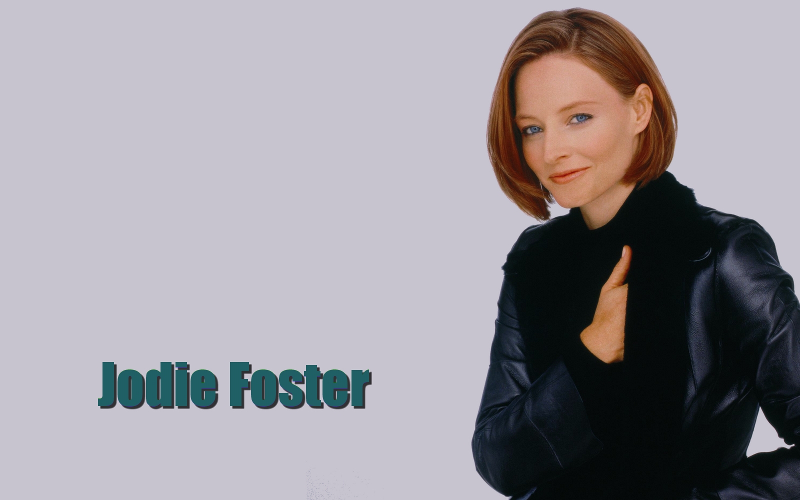 Description: A woman in a black jacket is posing for a picture with her hands on her chest and the words jodie foster.