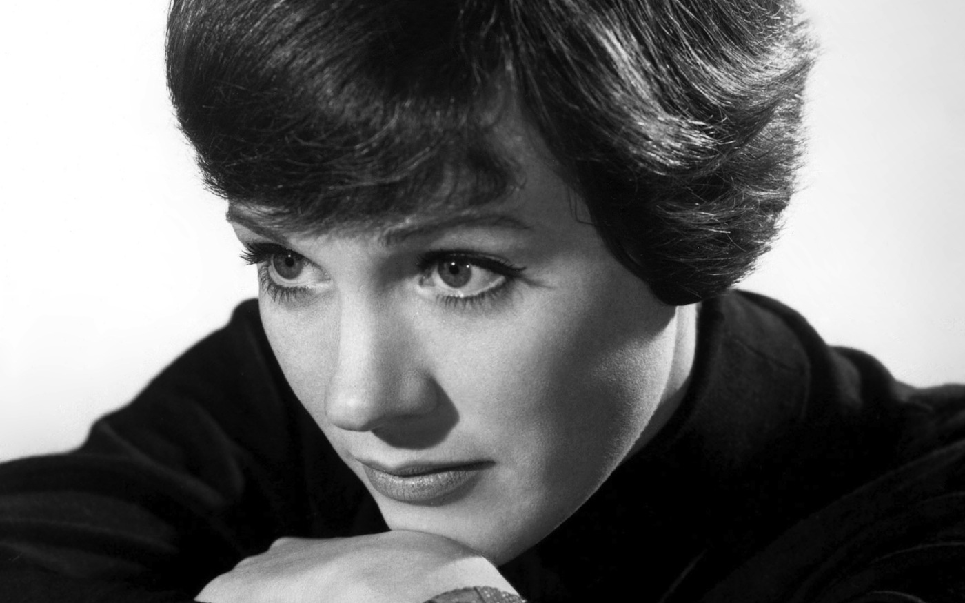 Description: A woman with a black jacket and a white shirt and a watch on her wrist and her hand on her wrist.