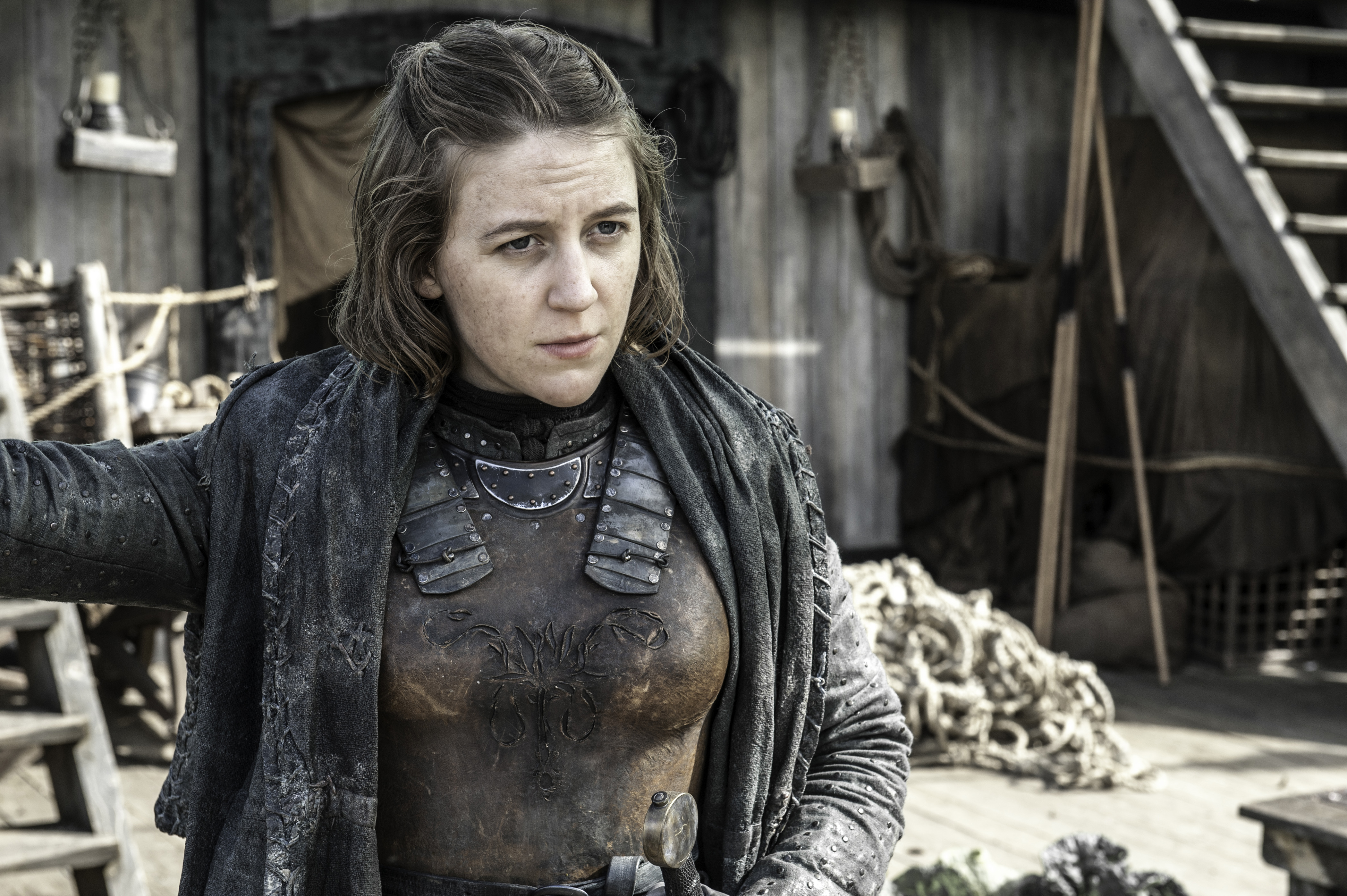 Description: A woman in a black outfit holding a gun in her hand and looking at the camera with a wooden building in the background.