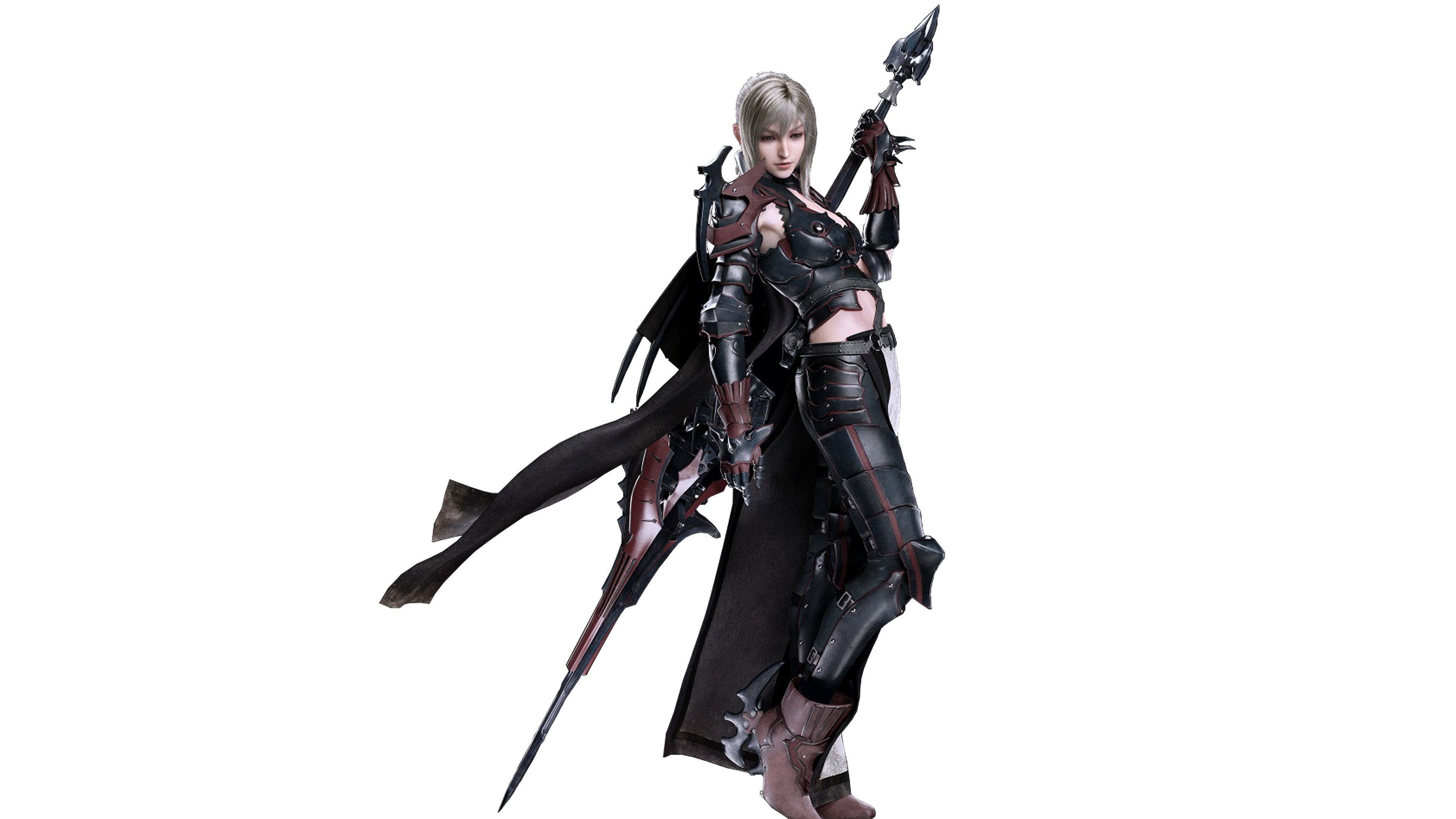 Description: A woman in a black outfit holding a sword and a sword in her hand.