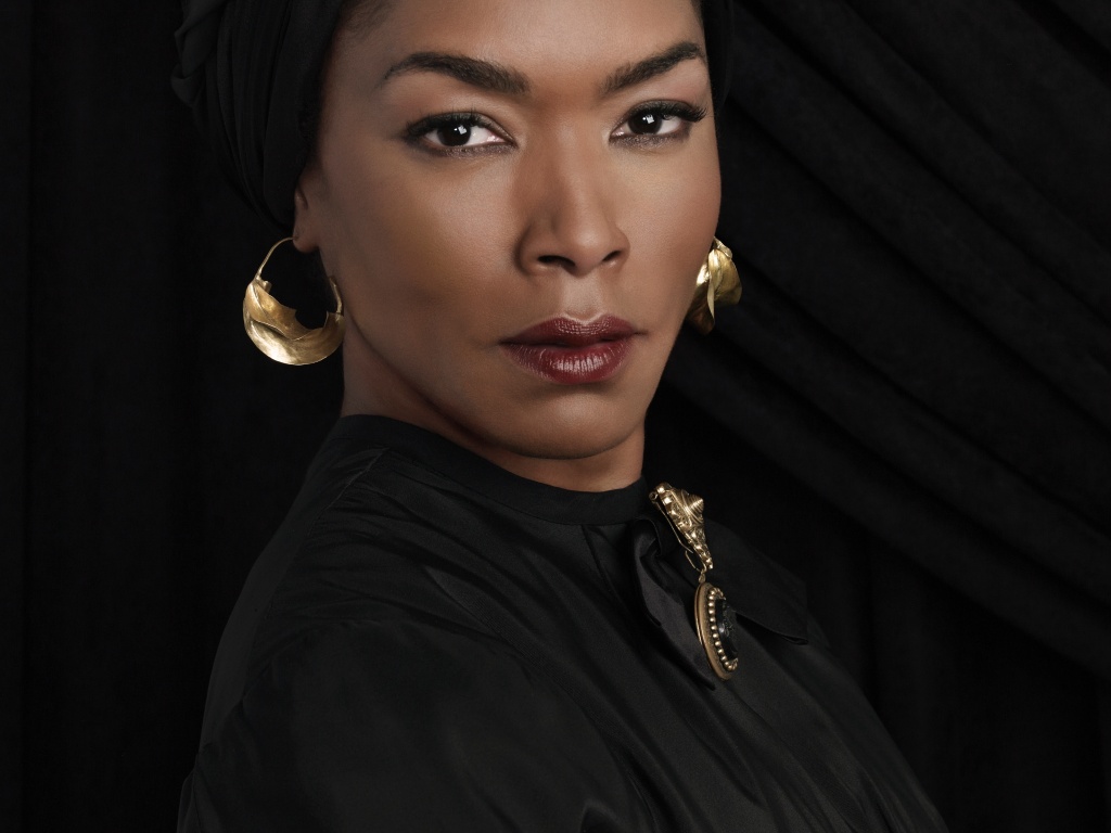 Description: A woman with a black shirt and gold earrings on her head and a black background with a black curtain.