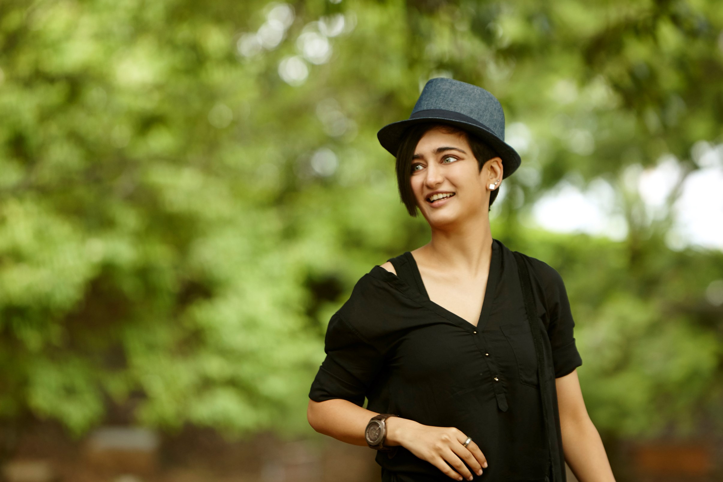 Description: A woman in a black shirt and a hat smiles at the camera while standing in a park with trees.