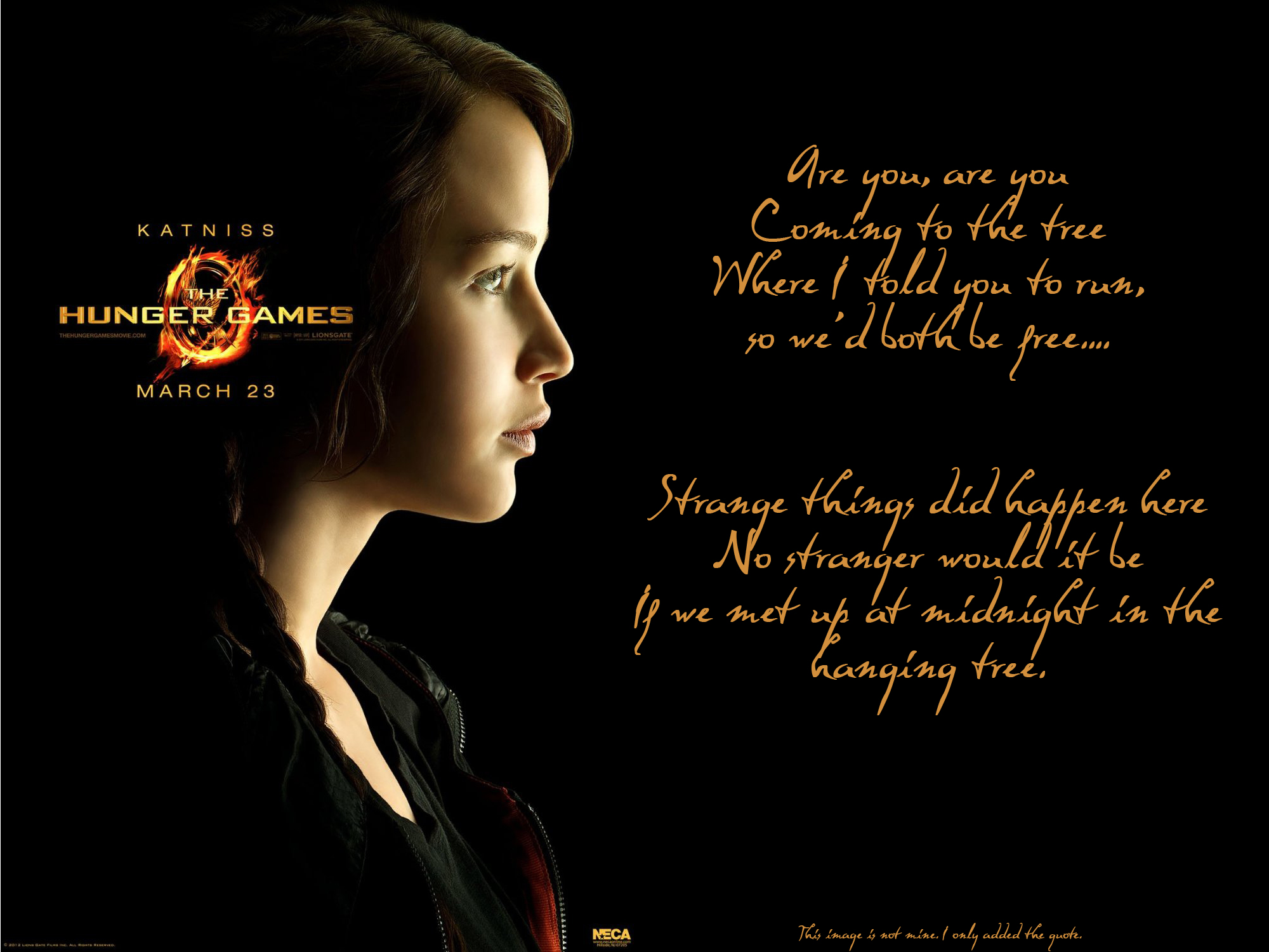 Description: A woman with a black shirt and a black background with a quote from the movie the hunger games on it.