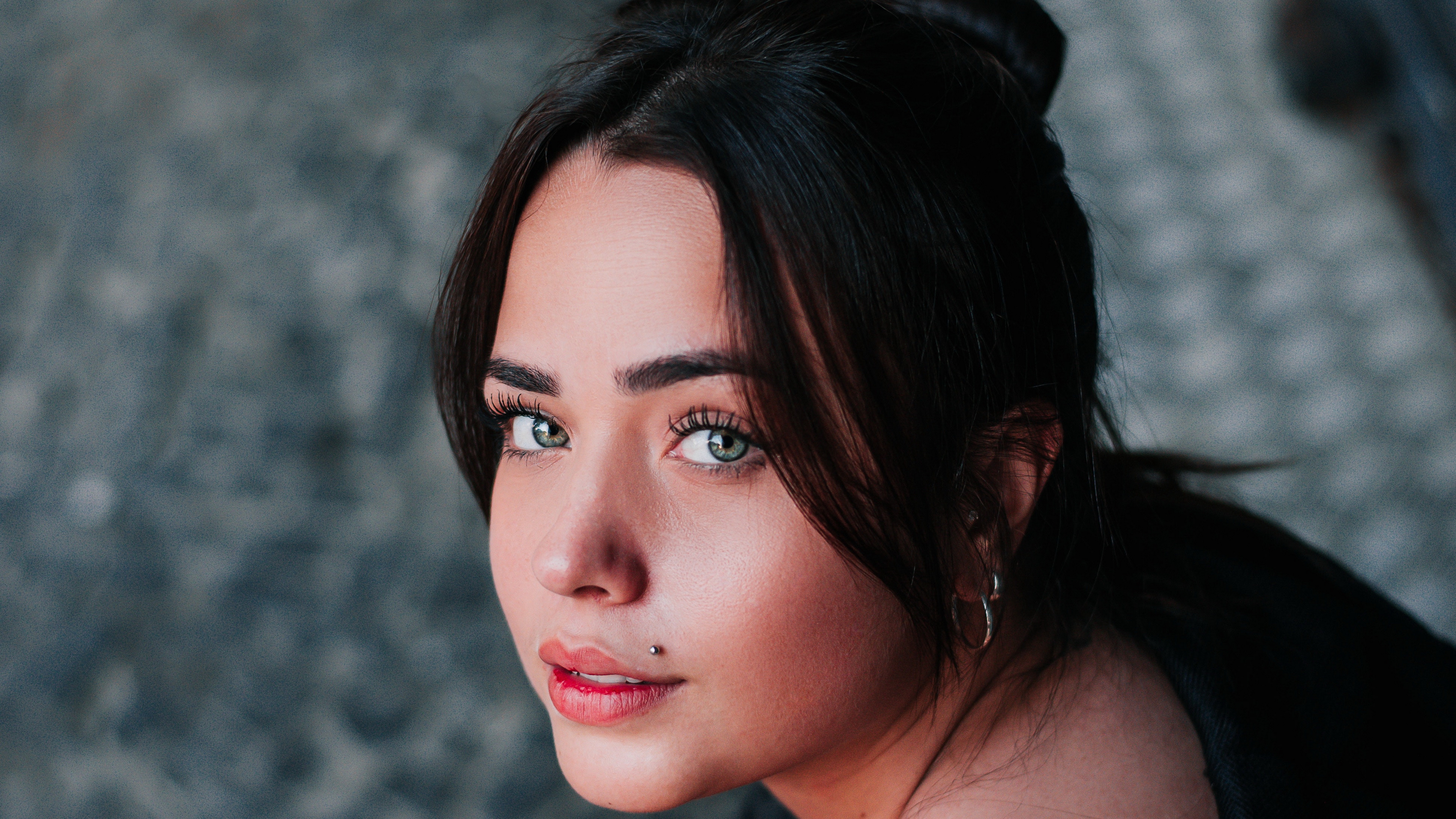 Description: A woman with a black shirt and a black top and a red tie and earrings on her head and a black shirt and a gray background.