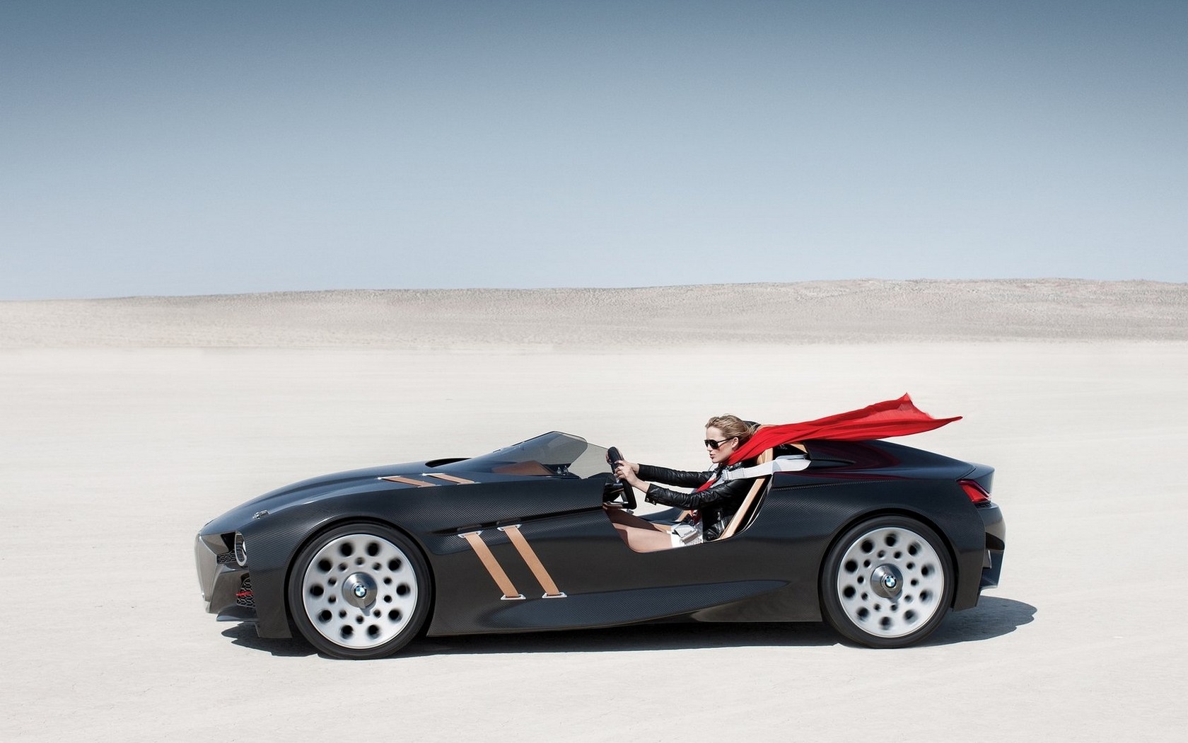 Description: A woman in a black sports car with a red cape on top of it's roof.