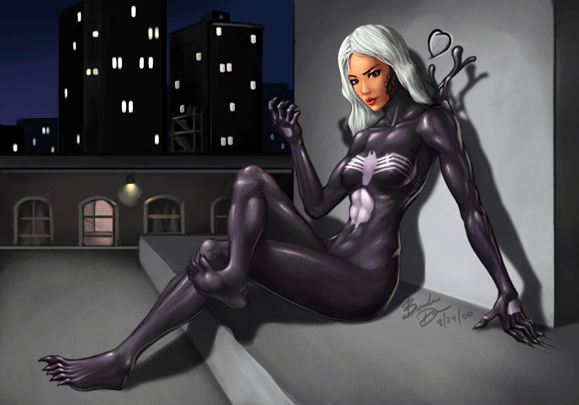 Description: A woman in a black suit sitting on a ledge in front of a city at night with a building in the background.