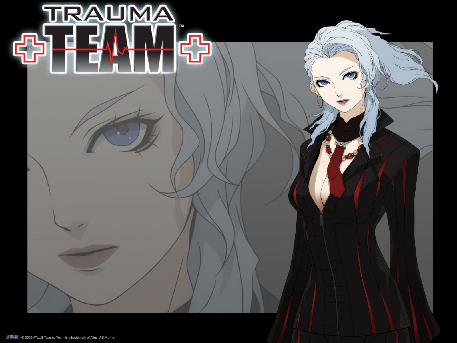 Description: A woman in a black suit with white hair and blue eyes.