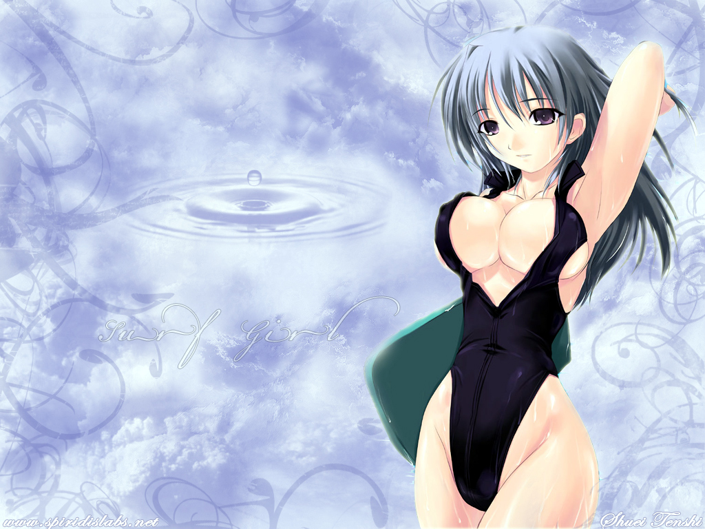 Description: A woman in a black swimsuit with a green skirt and a blue background with swirls and bubbles.