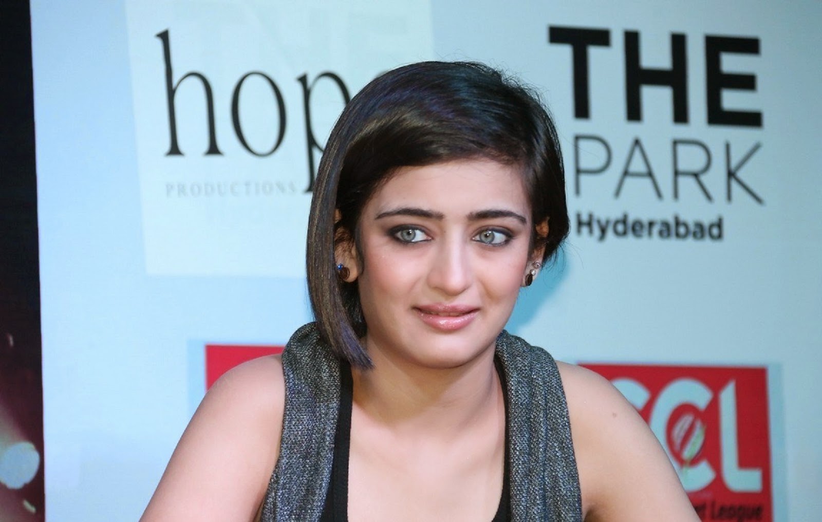 Description: A woman with a black top and a gray scarf around her neck and a red and white sign behind her.