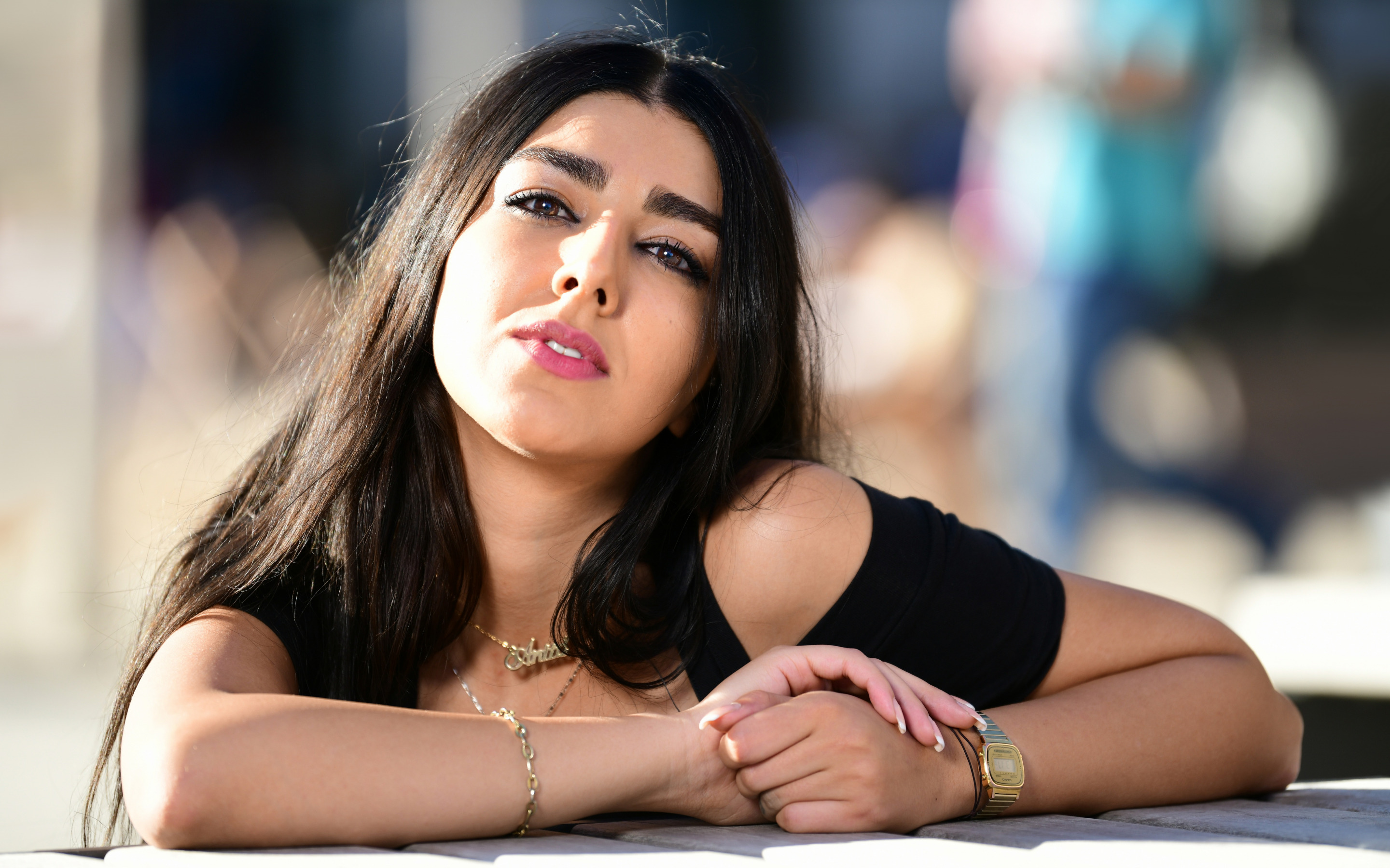 Description: A woman with long hair and a black top is leaning on a table with her arms crossed and looking off to the side.
