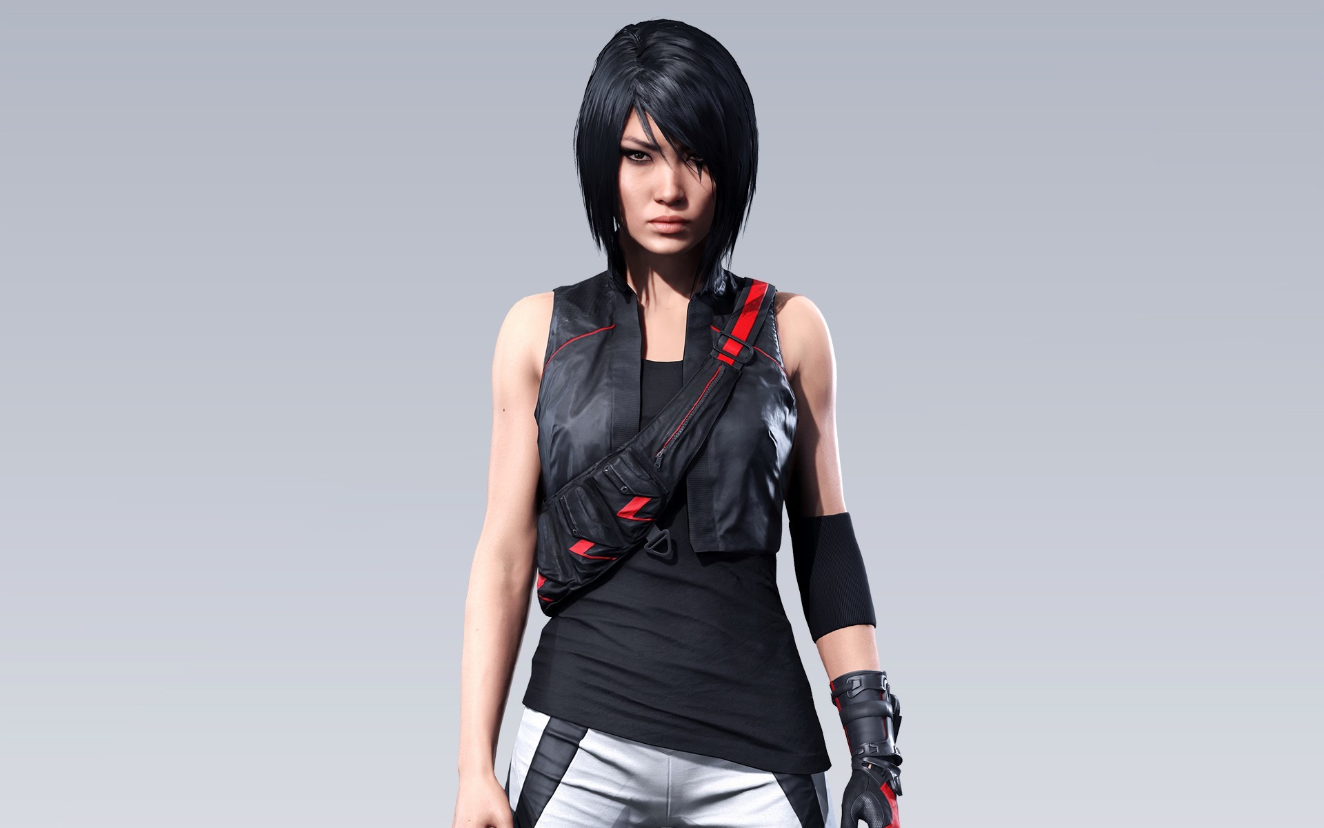 Description: A woman in a black top and silver pants with a gun in her hand and a black vest on.