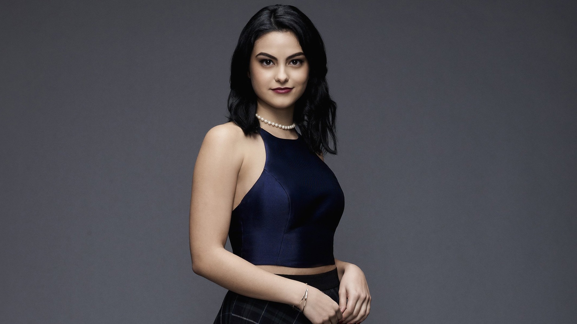 Description: A woman in a black top and skirt posing for a picture with her hands on her hips and her right hand on her hip.