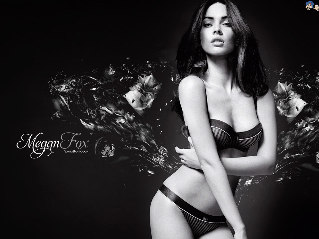 Description: A woman in a black and white photo with flowers on her chest and her arms crossed.
