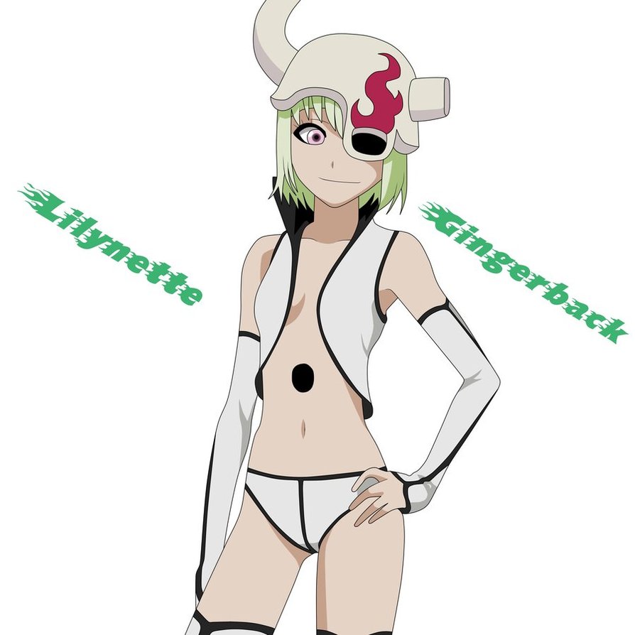 Description: A woman in a white and black outfit with horns on her head and a red eye patch on her face.