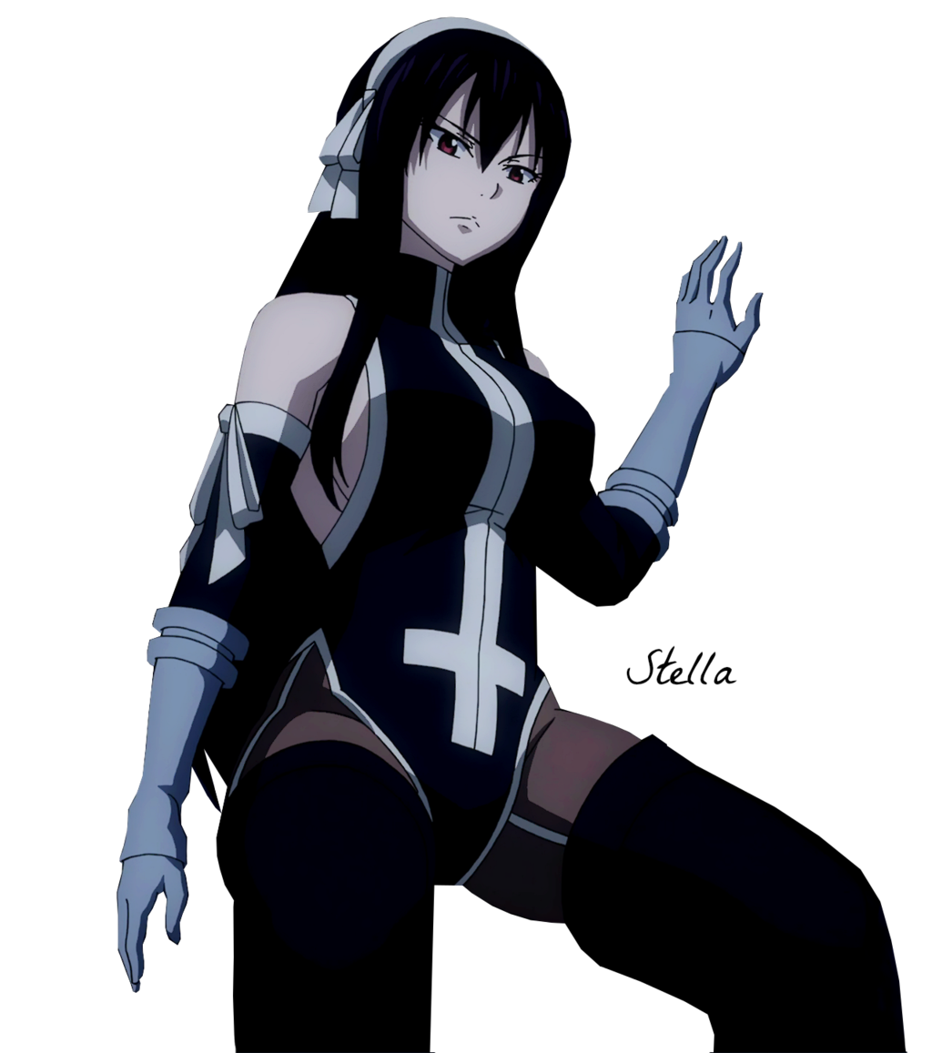 Description: A woman in a black and white outfit with a cross on her chest and hands up in the air.
