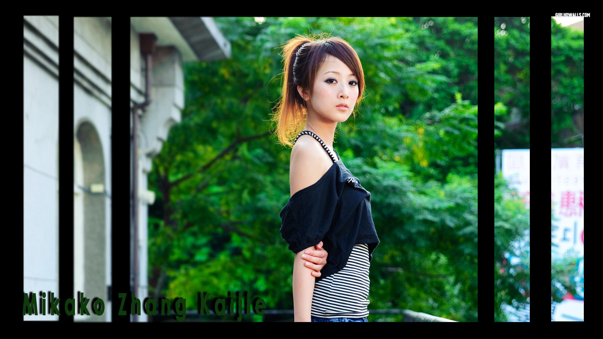 Description: A woman with a black and white striped shirt and a black and white striped skirt and a green tree.