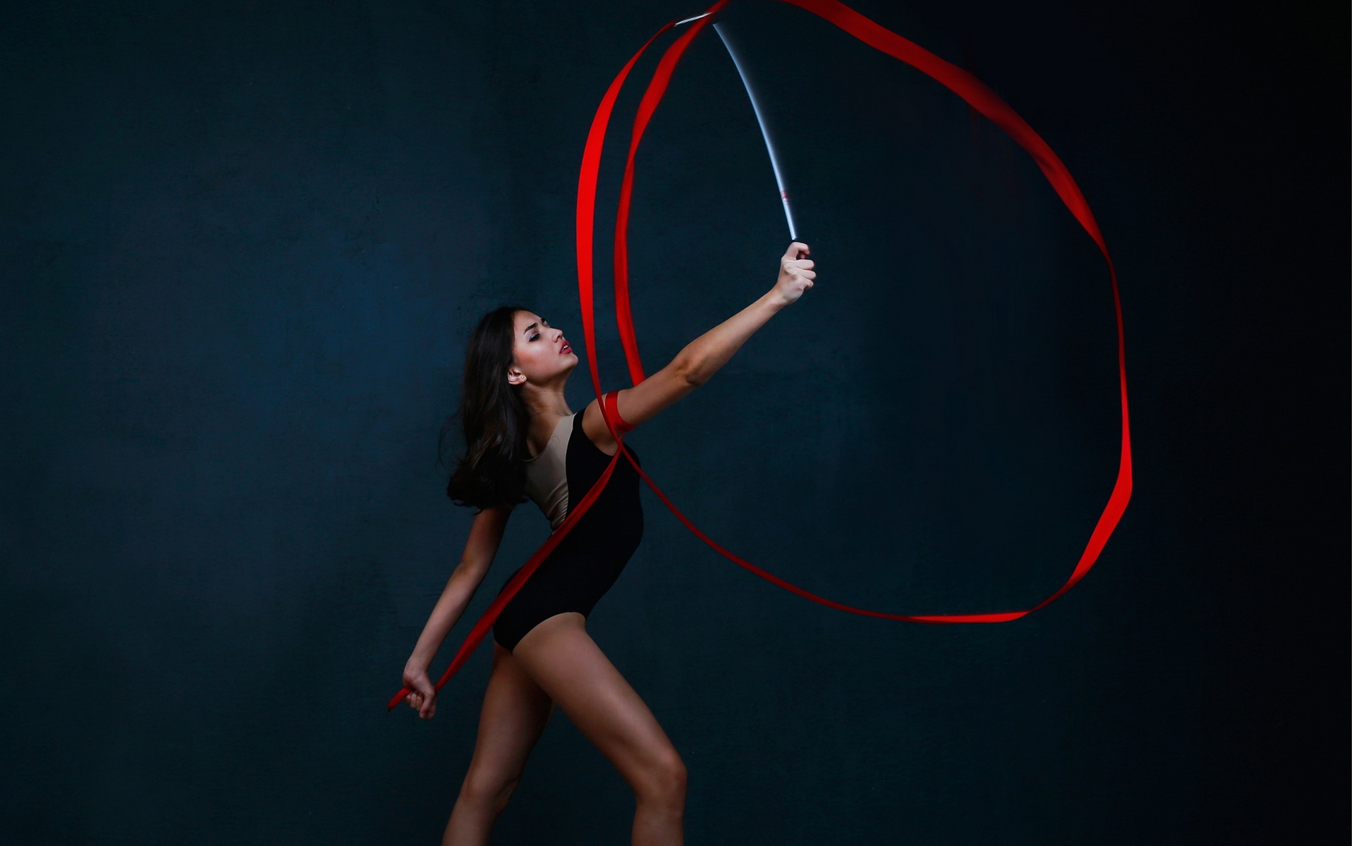 Description: A woman in a black bodysuit holding a red ribbon and a sword in her hand with a black background.