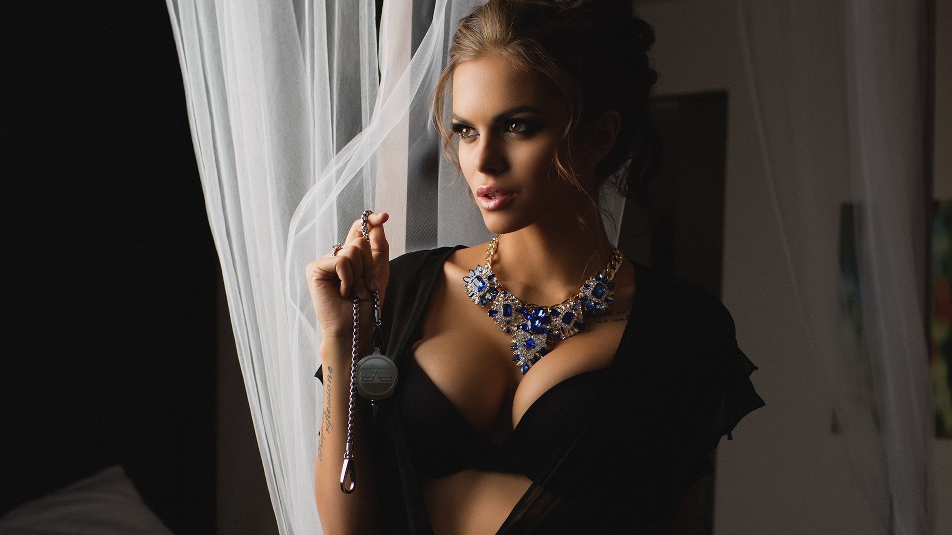 Description: A woman in a black dress with a necklace on her neck and a watch on her arm.