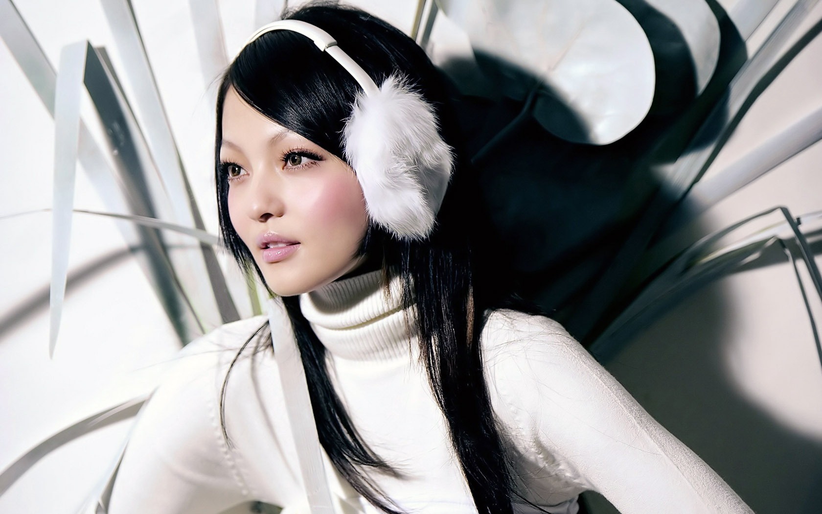 Description: A woman with long black hair wearing headphones and a white turtle neck sweater with a white and black design.