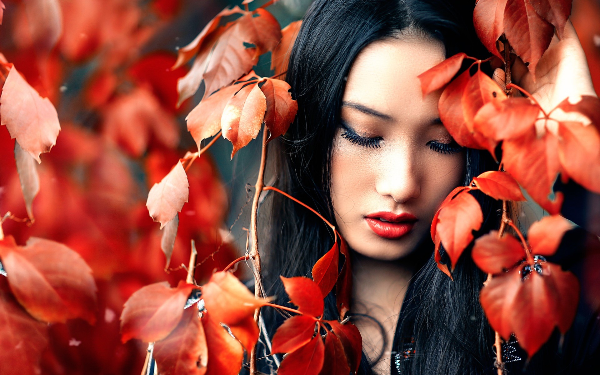 Description: A woman with long black hair and red leaves on her head is looking down at her face and her eyes are closed.