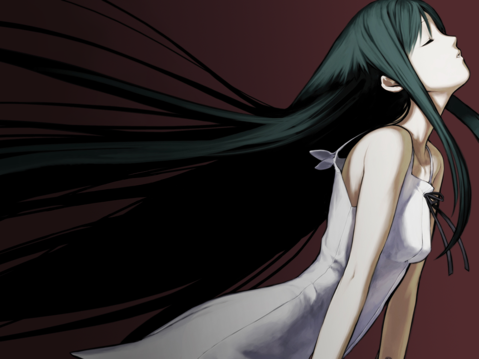 Description: A woman with long black hair and a white dress is looking up at something in the air with her long black hair.